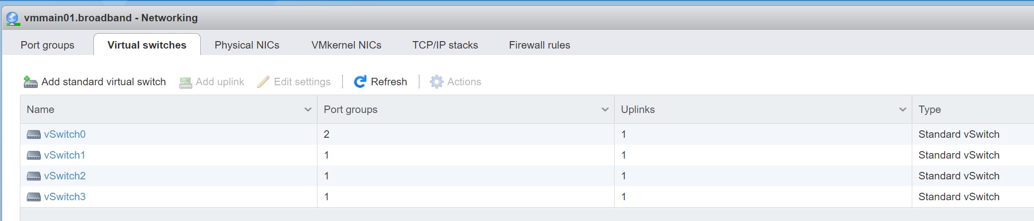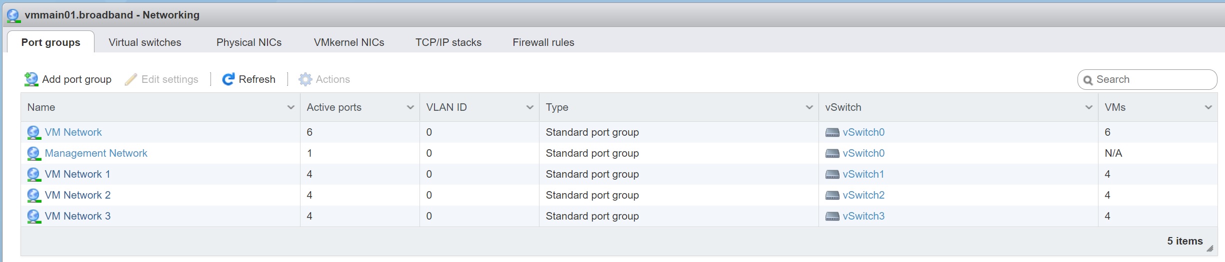 I then setup 4 port groups that relate back to the physical NIC's by assign the switches we configured above, this makes it easy to add the networks to the nested ESXi servers when I build them