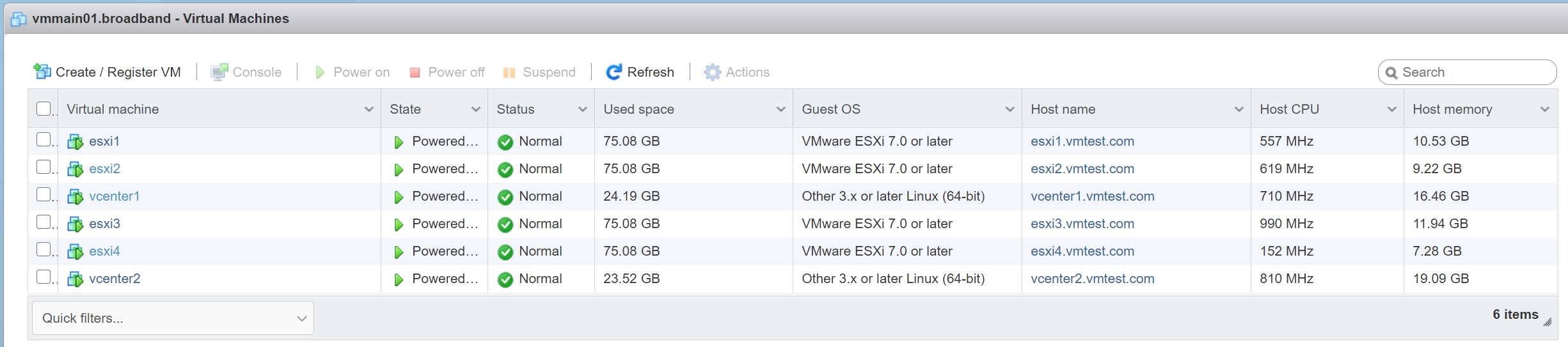 I then created 4 nested ESXi servers, I install two vCenter servers, vcenter1 will manage esxi1 and esxi2 servers and vcenter2 will manage esxi3 and esxi4. This would represent two Data Centers (DC's) that we will replicate and perform Replication/SRM operations. I have another vcenter section on how to install vcenter and configure it.
