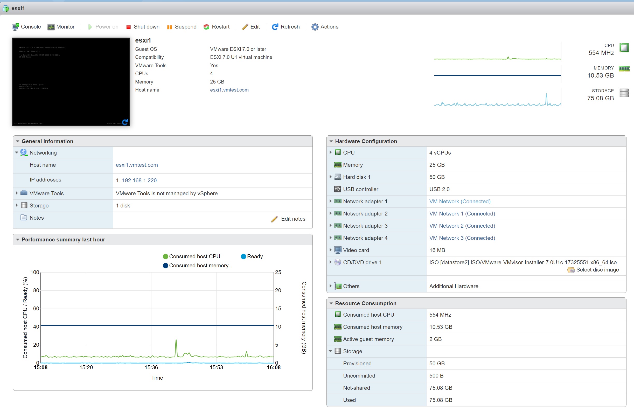 The nested ESXi server configuration can be seen below, its a simple 4 vCPU with 25GB of memory which is more than enough for this testing environment, notice the 4 networks added which represent the 4 physical NIC's on the physical server, again I use the latest ESXi 7.0U1c.