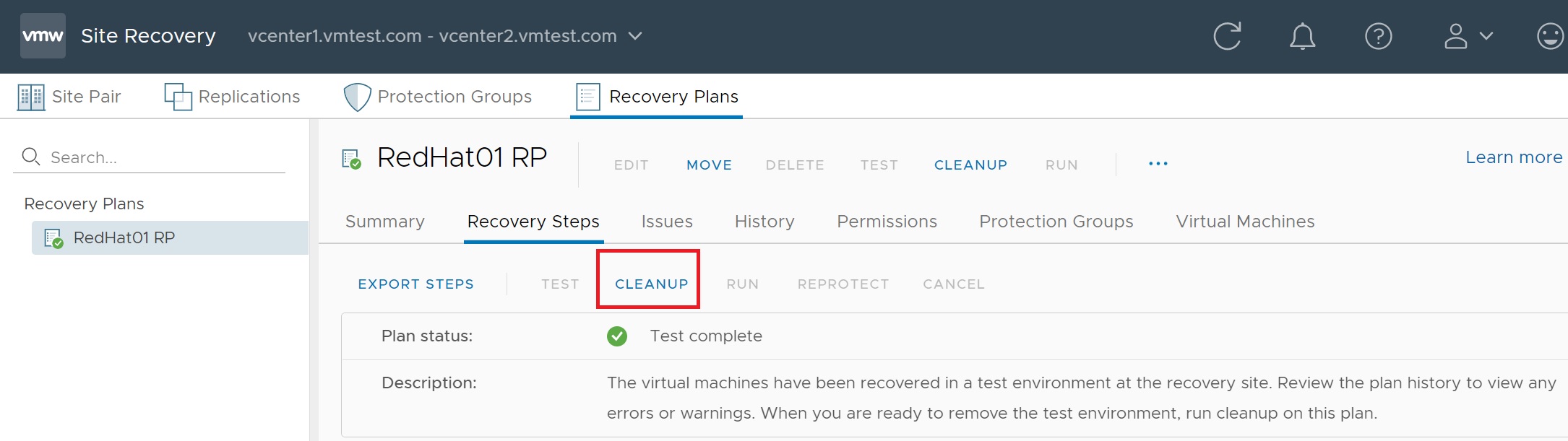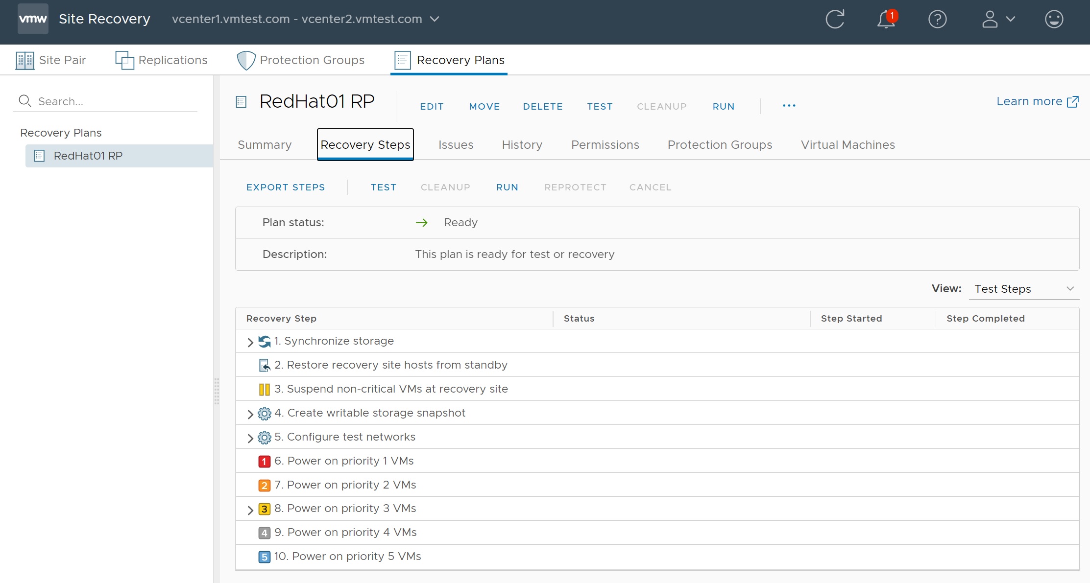 So lets test the recovery of redhat01 VM to the other site (or DC), select the Recovery Plans tab, then select the RedHat01 RP plan (or the one you created), then select the Recovery Steps and the Test link