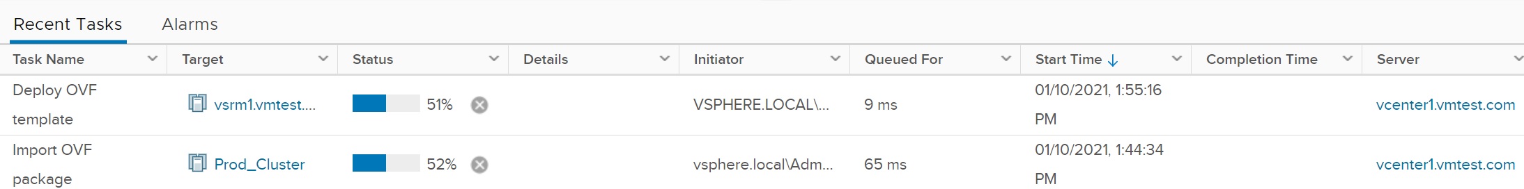 You can check on the progress in the recent tasks list at the bottom of the vCenter login page