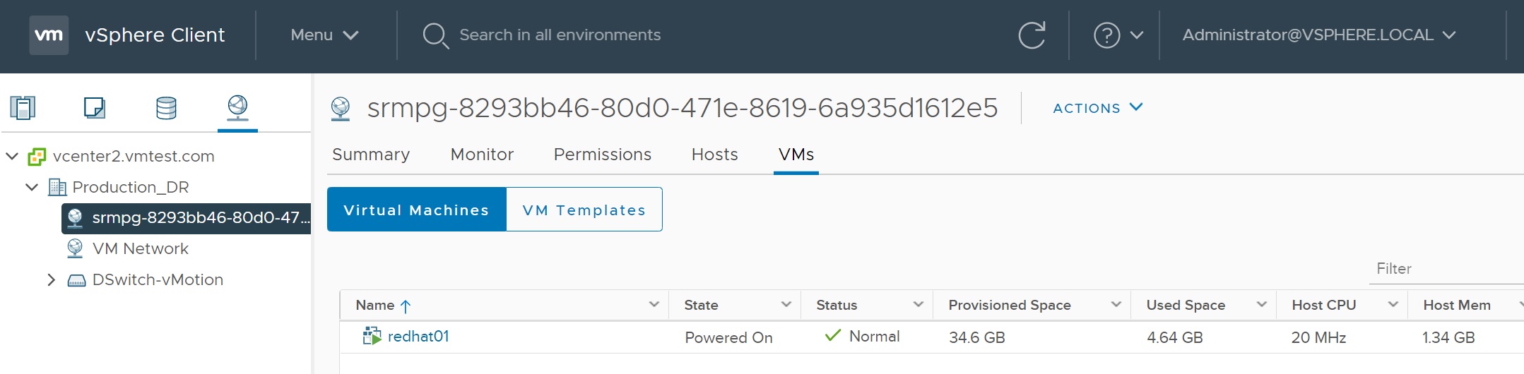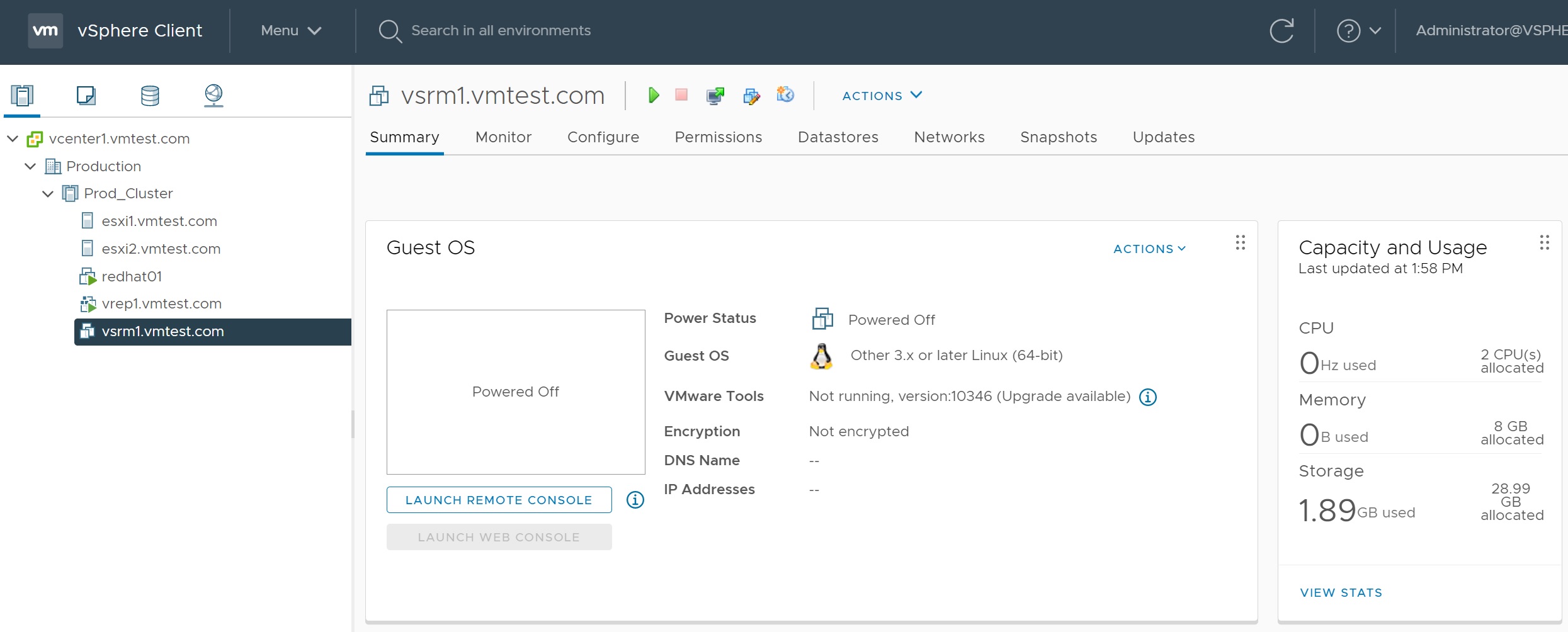 Going to the vCenter2 we now see that a replicated redhat01 VM has been copied and is up and running, remember that we asked to create a separate network when testing VM's which is why you see 2 IP address, so this won't impact the LIVE redhat01 that is currently running on the other production cluster, now you can login to this server and check the RPO times and that files are being kept up to date by the replication process, etc.