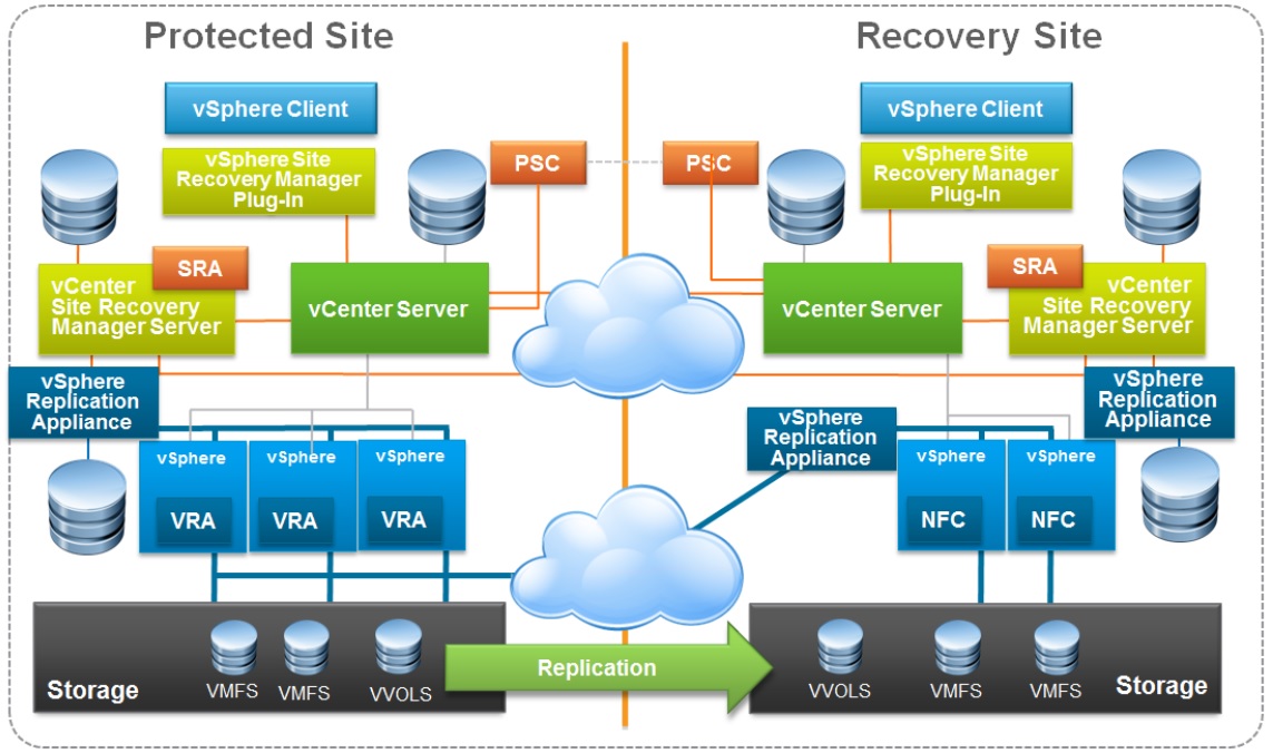 Below is a document from VMWare which explains the complete setup, you can also use vendors replication tools, basically the Replication and Site Recovery Manager servers hook into the vCenter server from here you can control the replication and the recovery of VM's should a disaster happen.