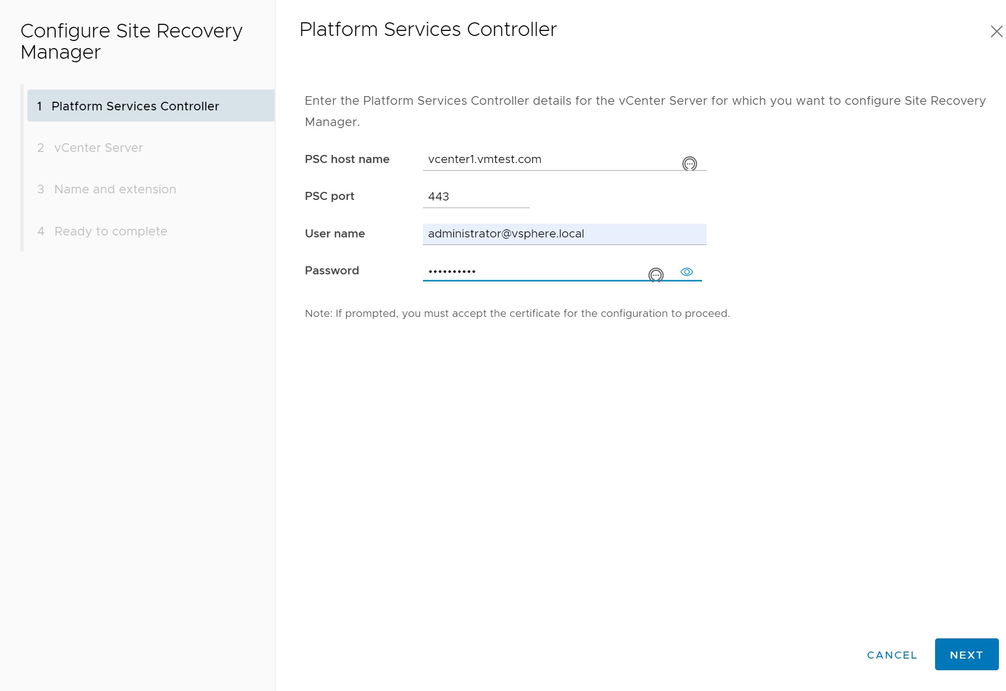 The first setup requires us to enter the vCenter server details (Platform Services Controller (PSC)), try and use FQDN