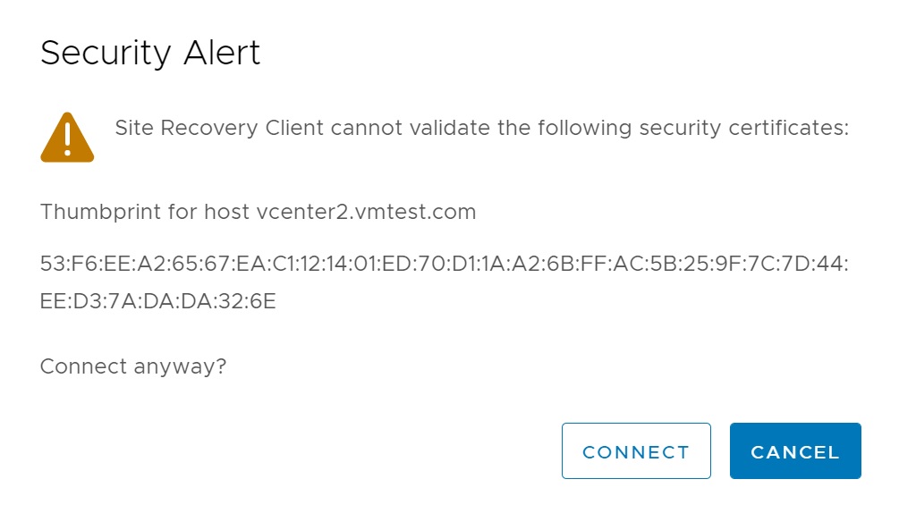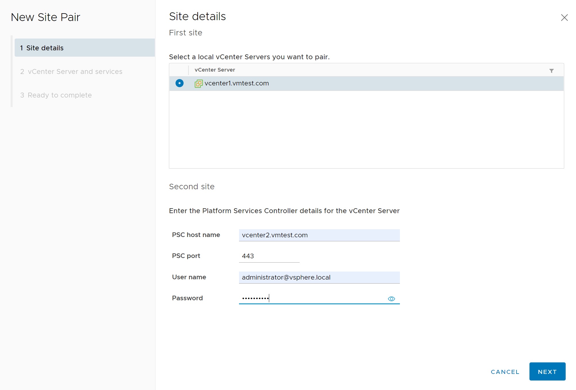 In the first setup screen we identify the vCenter we wish to pair with, we can see the local vCenter (vcenter1) and the secondary site vCenter (vcenter2)