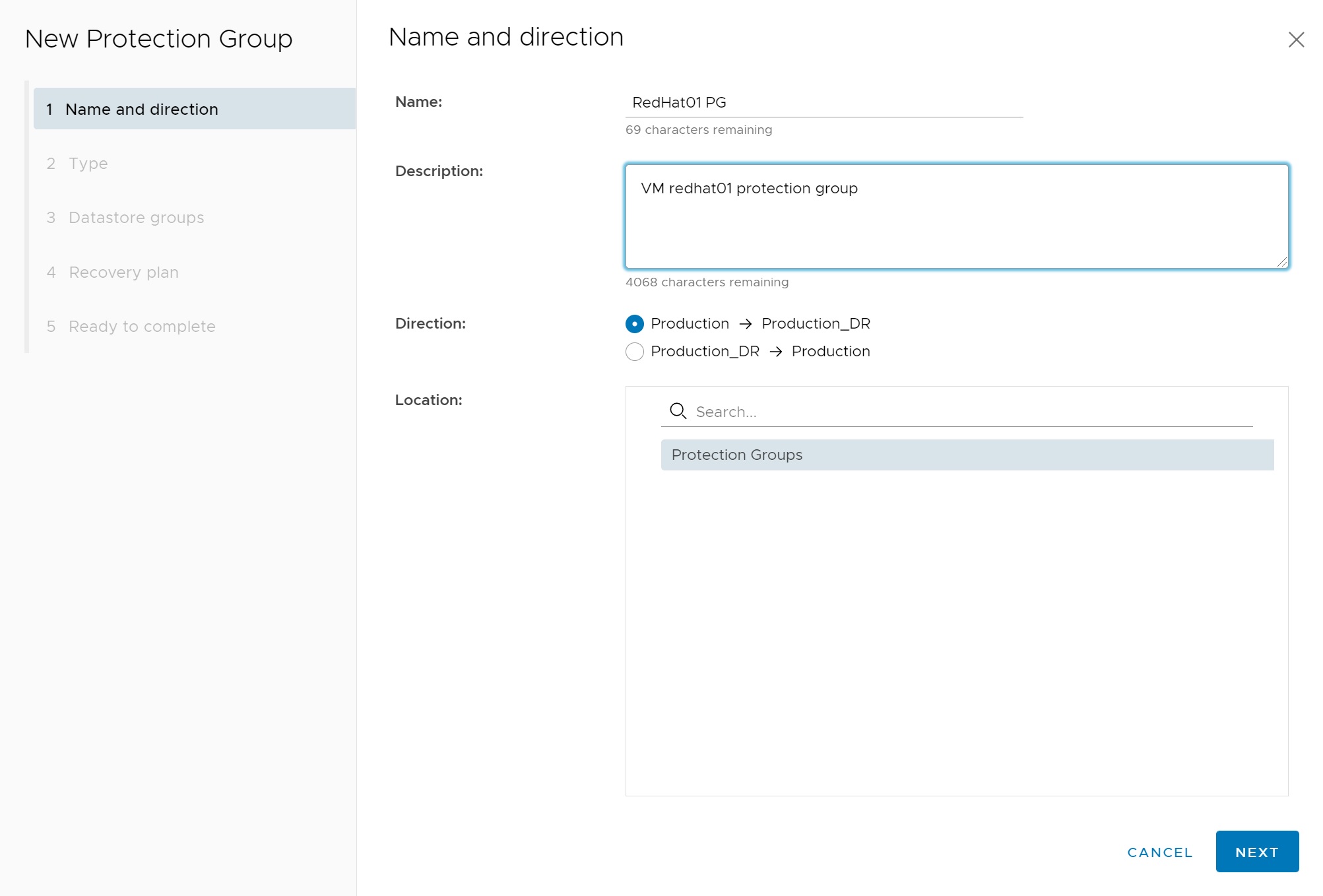 The first setup screen requires some details of the protection group itself, name, description, the direction of the protection, in my example redhat01 VM normally resides in the Production side with the replicated one on the Production_DR side, should Production go down then we can restart it on the Production_DR side.