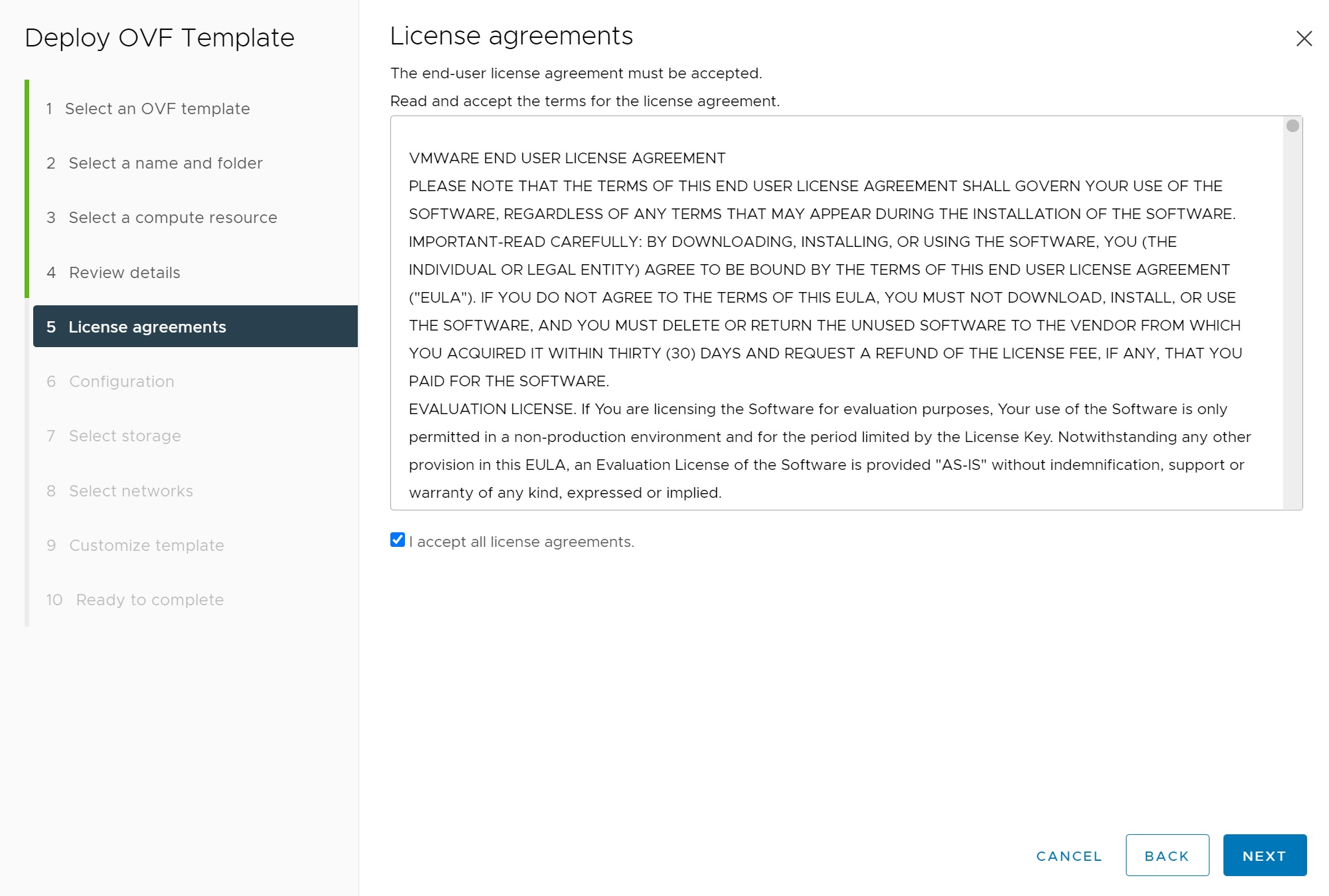 We use the vCenter server to install the OVF template, which takes us to a number of setup screens