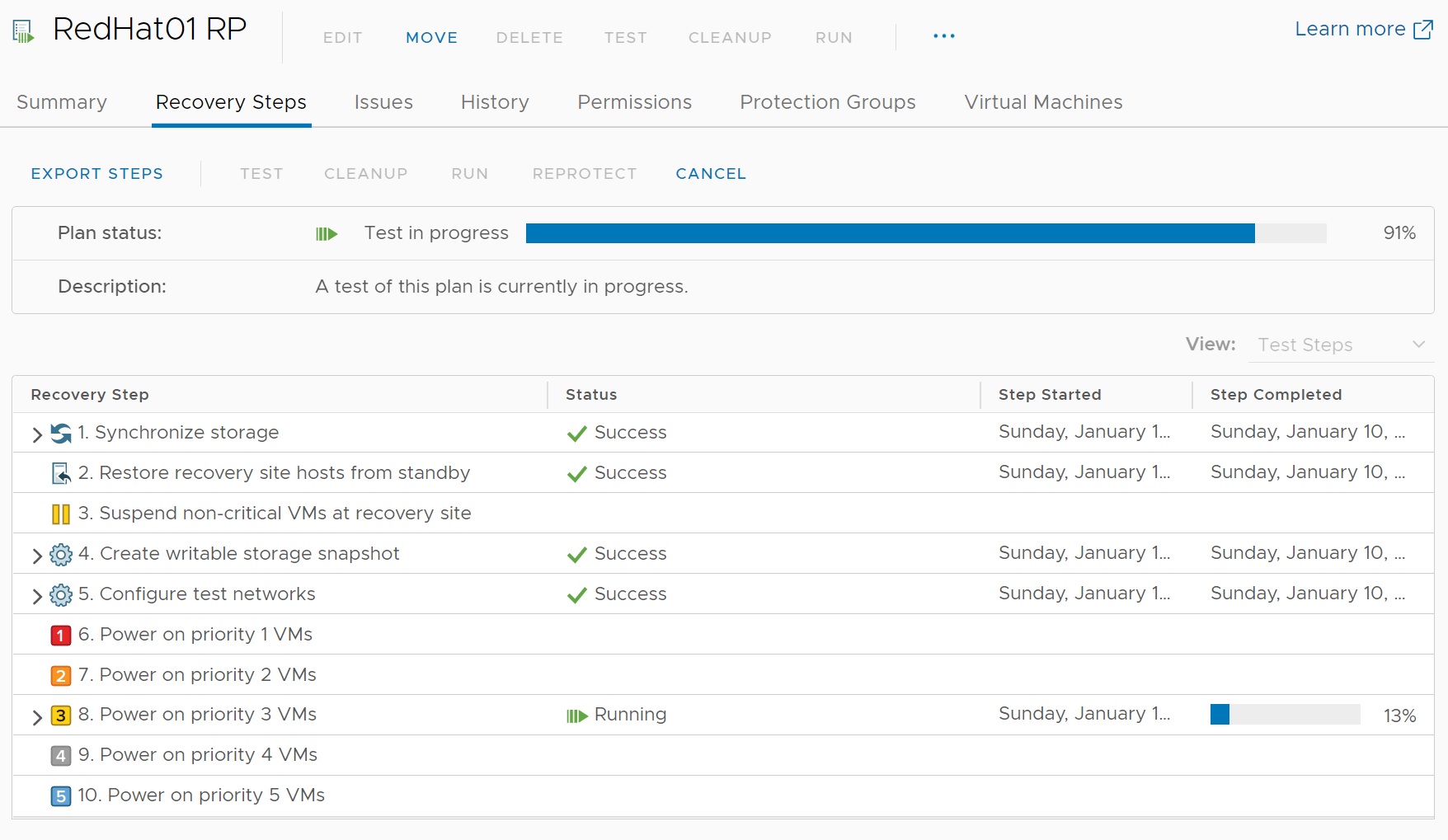 Returning back to the Recovery Plan -> Recovery Steps screen we can start to see the progress of the recovery to the other site.