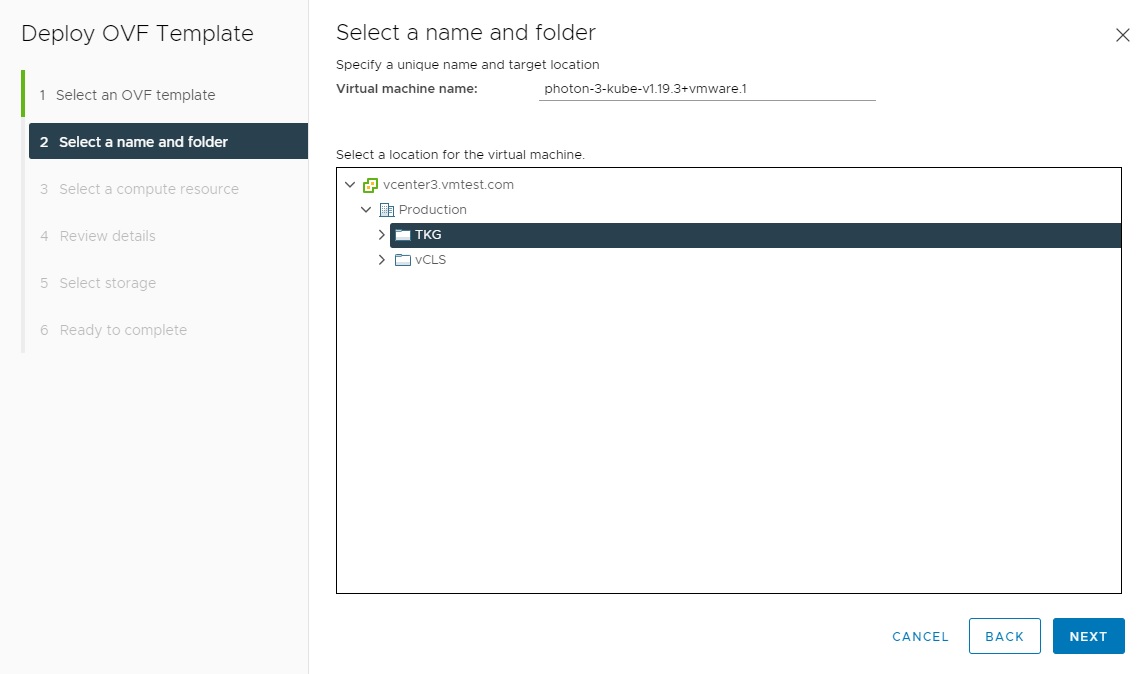 Next we specify the VM folder and the Datastore and the VM cluster we setup