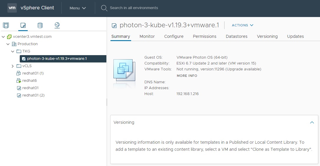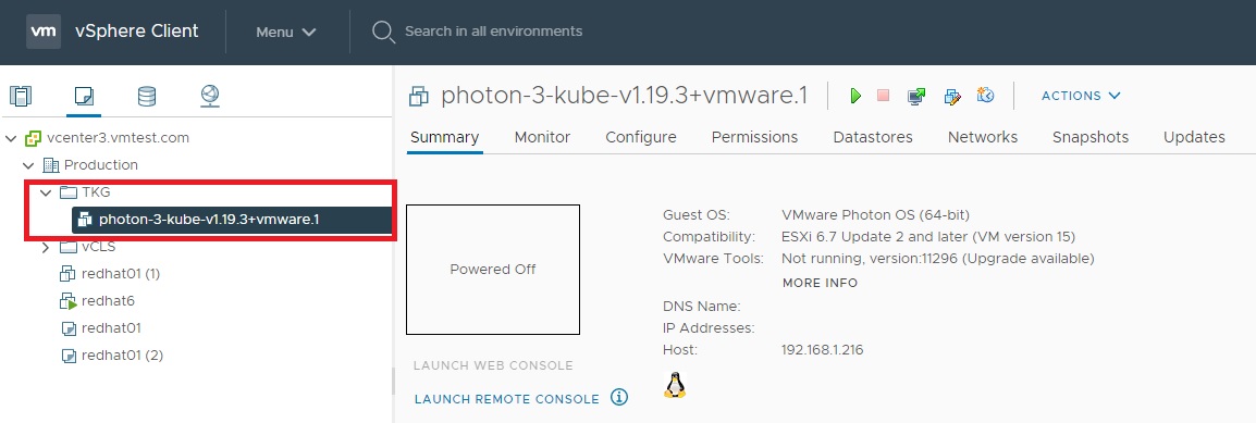 Returning to the vCenter we can see that the kubernetes cluster has been created, we see the single control plane and the single worked we requested to be installed.