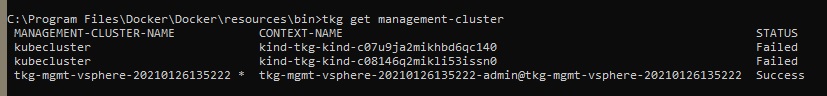 Once the installation has finished you can confirm that the management kubernetes cluster is running by using the tkg and running the command tkg get management-cluster, as you can see below I did hit a few issues and thus you see the 2 failed installations