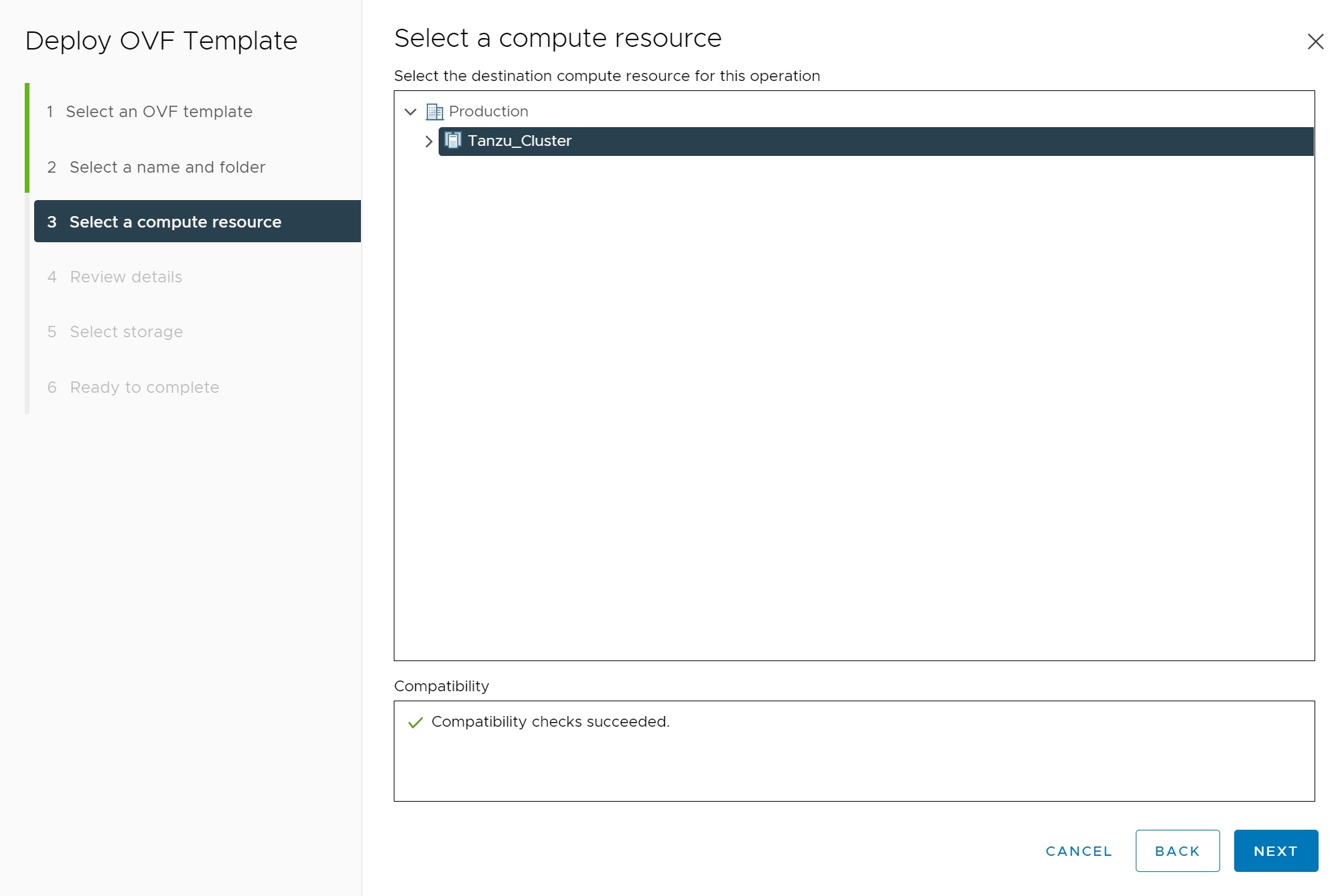 Next we select the cluster (compute resource) that we want the kuberneters cluster to be created in