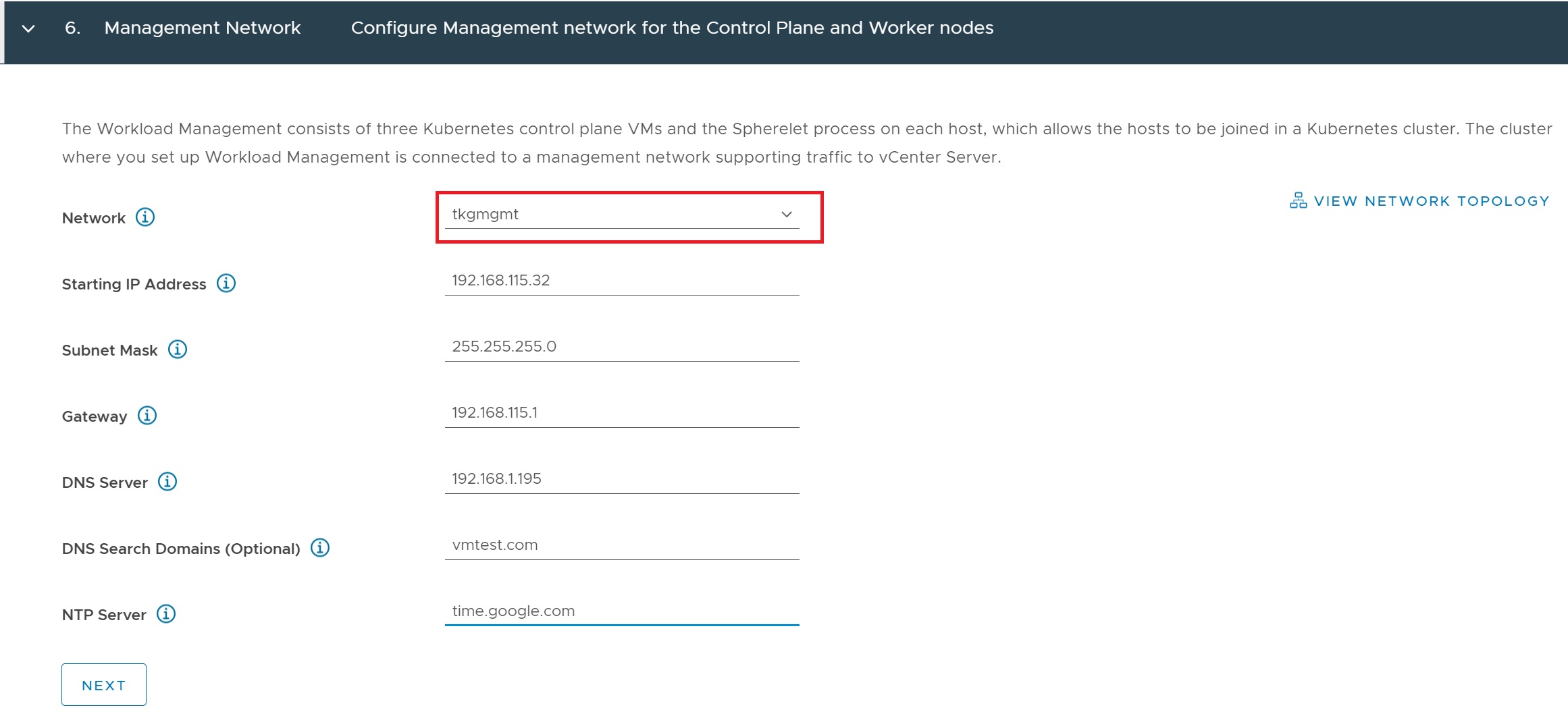 The next screen we setup the management network, make sure you select the right network in my case tkgmgmt