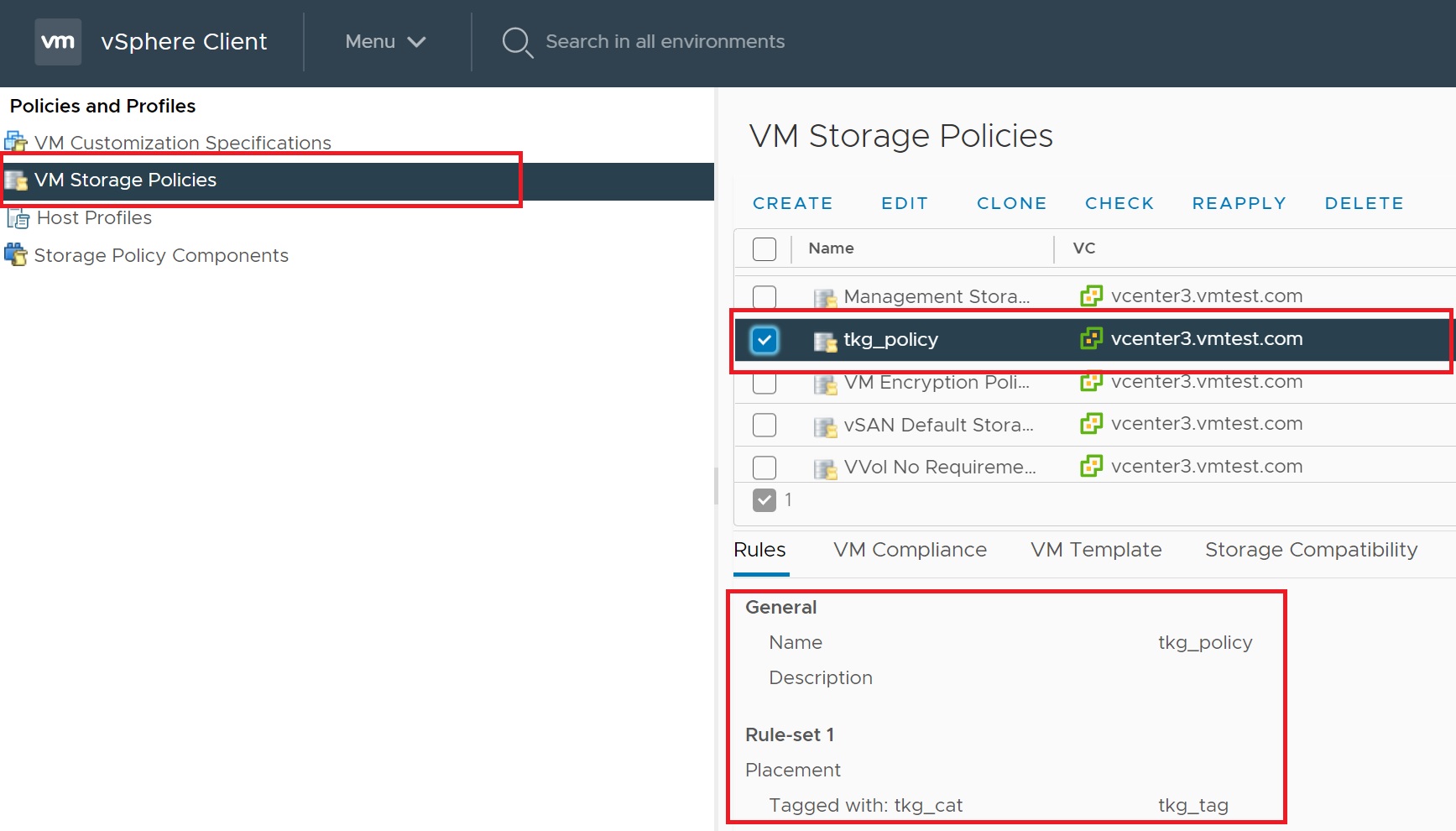 Next we create a basic VM storage Policy called tkg_policy which we add the tkg_tag tag that has the Datastore attributes.