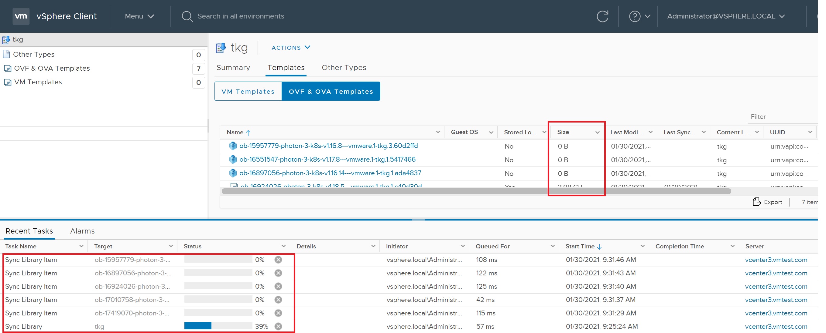 Next we select the tkg content library where we downloaded the OVF/OVA files