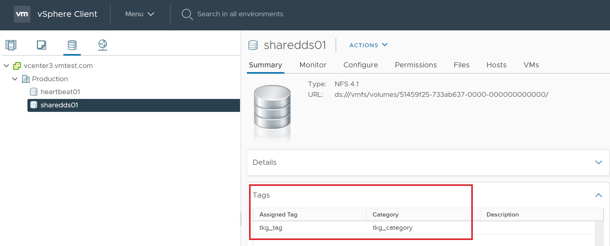 We then add the tkg_tag to the sharedds01 storage, we will use the tag later which will use this datastore.