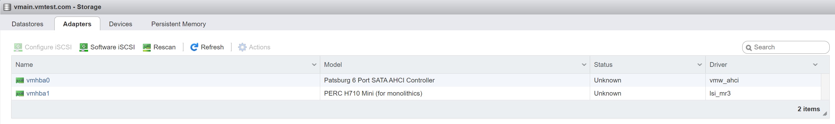 Once the installation has finished all the storage controllers will be configured, as you can see below the DELL R620 has two default storage controllers, one has the cdrom attached the other has the disk storage attached. You can also have a iSCSI adapter which I will walk through setting up to a synology SAN later.