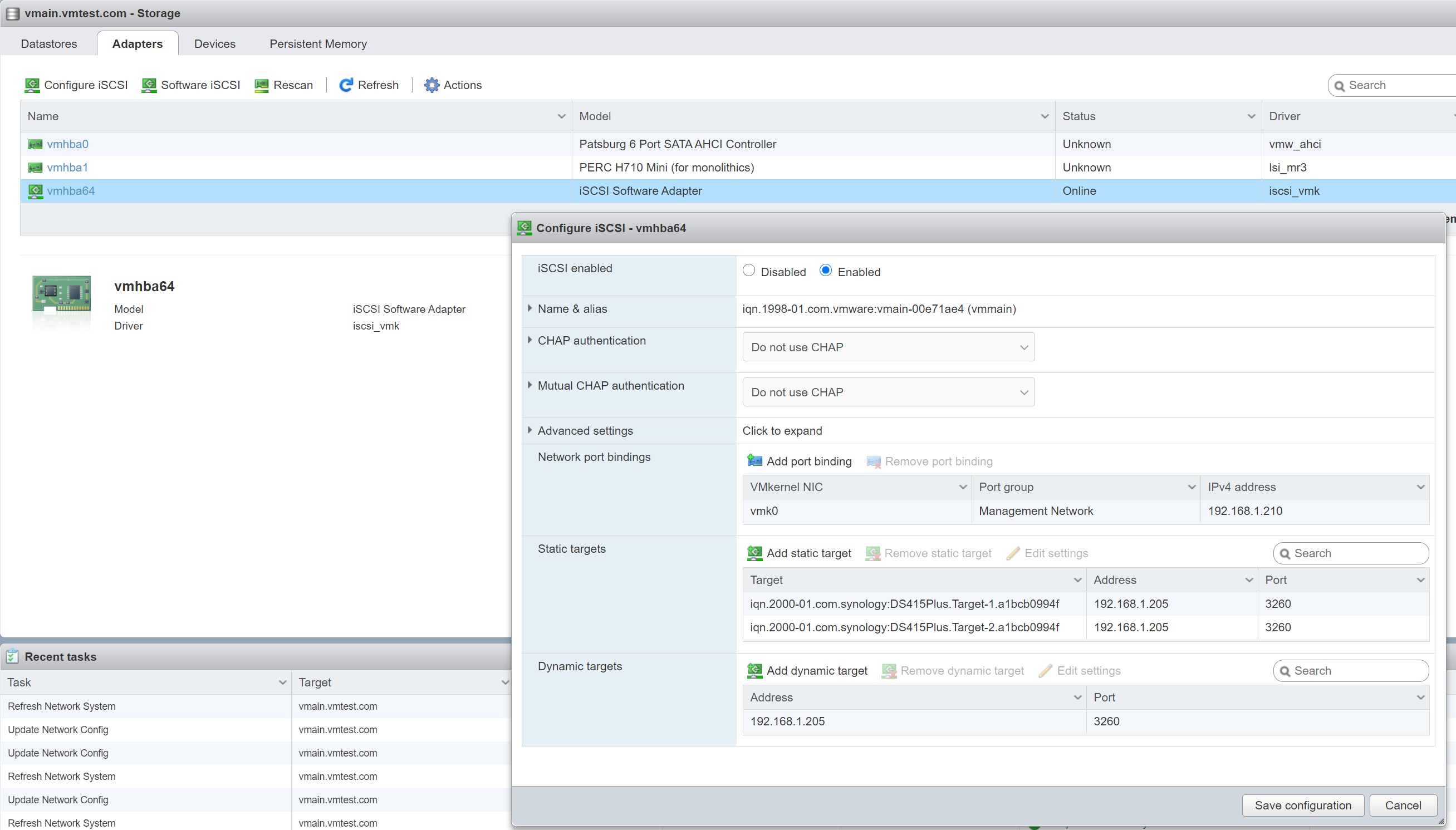 Regarding the multipath, the Synology SAN already provides this, as you can see I have a bonded interface using two NIC's on the Synology SAN itself, you could also create a dedicated switch (also using two NIC's) using MTU 9000 (Jumbo Frames) to increase performance. You can also use the command esxcli storage to add additional IP's addresses to the same SAN as well but depends on how you setup your SAN.