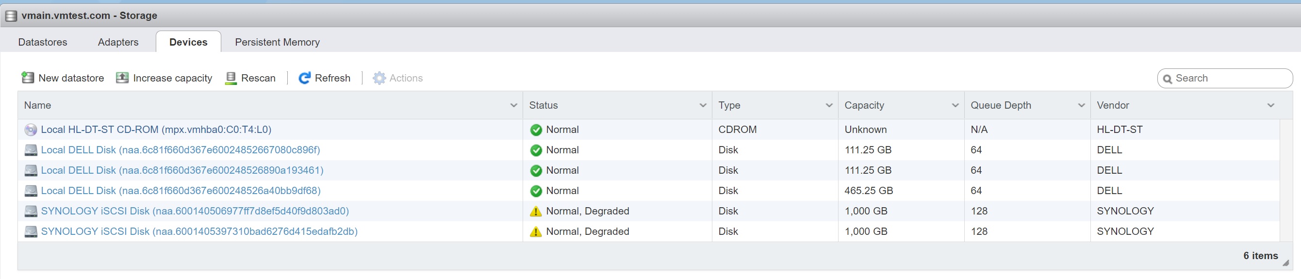 Once the iSCSI has been setup you should be able to see the disk devices in the devices screen, as you can see below the two LUN's (devices) are available, you might notice that they are in normal, degraded mode, in my case they have only a single network path and should that path go down then i will lose the connection to these devices.