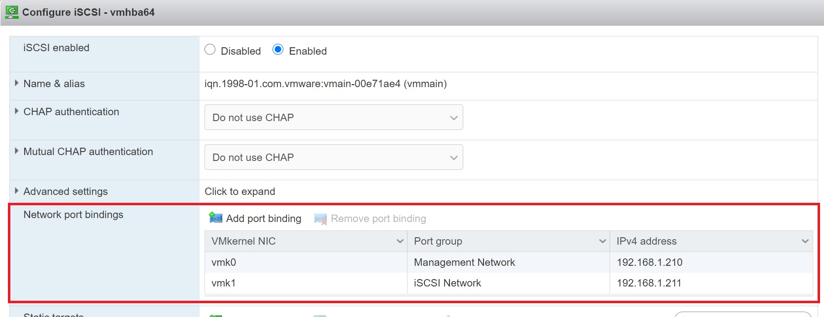 iSCSi has it own naming convention, its uses the iSCSI Qualified Name (IQN), it a bit like a DNS name or reverse DNS. The below image is my current iSCSI setup as mentioned in my test environment, this is configured when you setup iSCSI using the Software iSCSI icon, I have binded iSCSI to a specifc port and then added the IP address of the dynamic target, once to save the configuration and open it again it should then pick any LUN's that are available, in the below you can see two LUN's where attached.