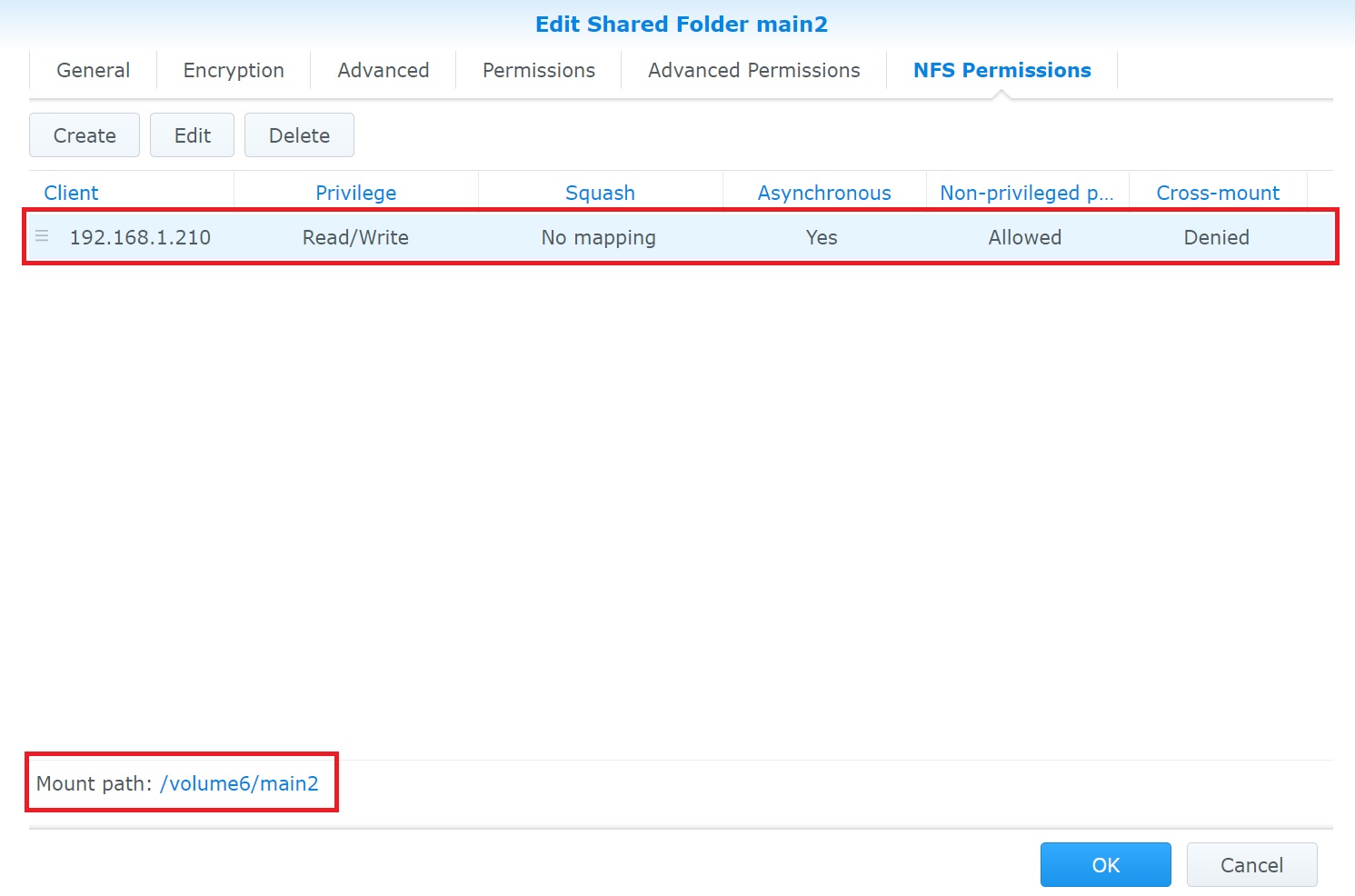 Next we can lock down that volume access using NFS permissions, as you can see below i have onl granted access to one ESXi server, also note the mount path at the bottom, you will need this when you create the datastore