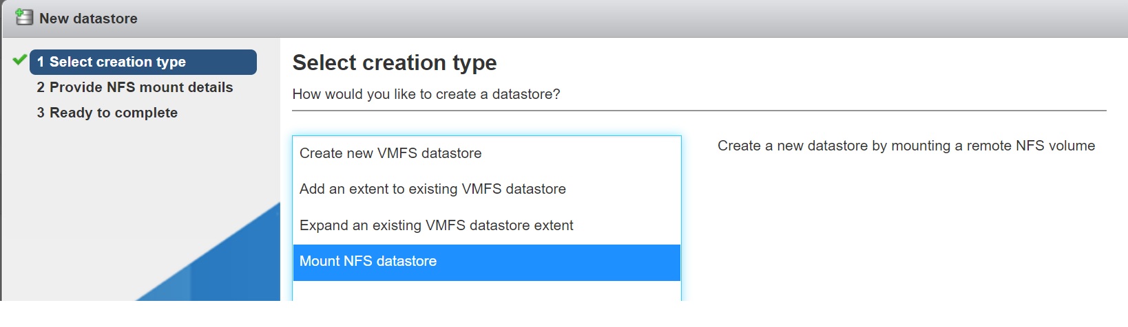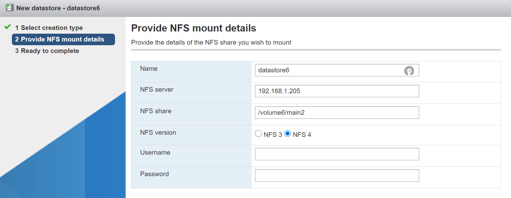 Next we supply the details the the Synology SAN and the mount path, I select the NFS4 version (has features like extra security, performance improvements, multipathing, etc) which has many extra features than version 3.