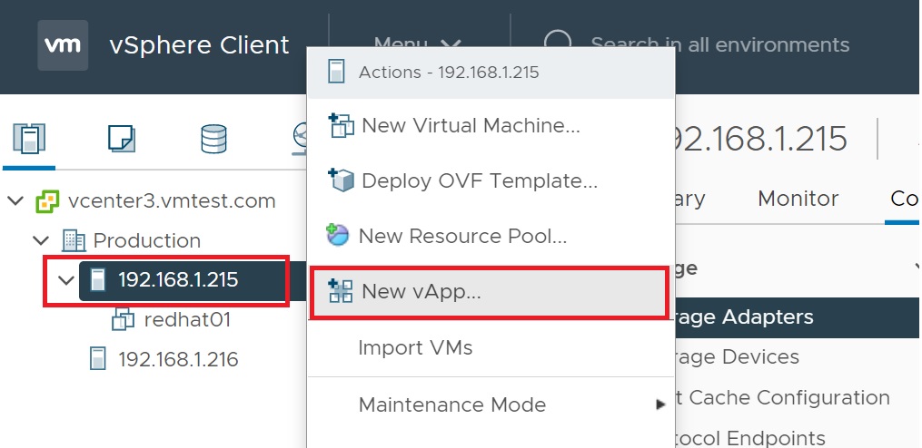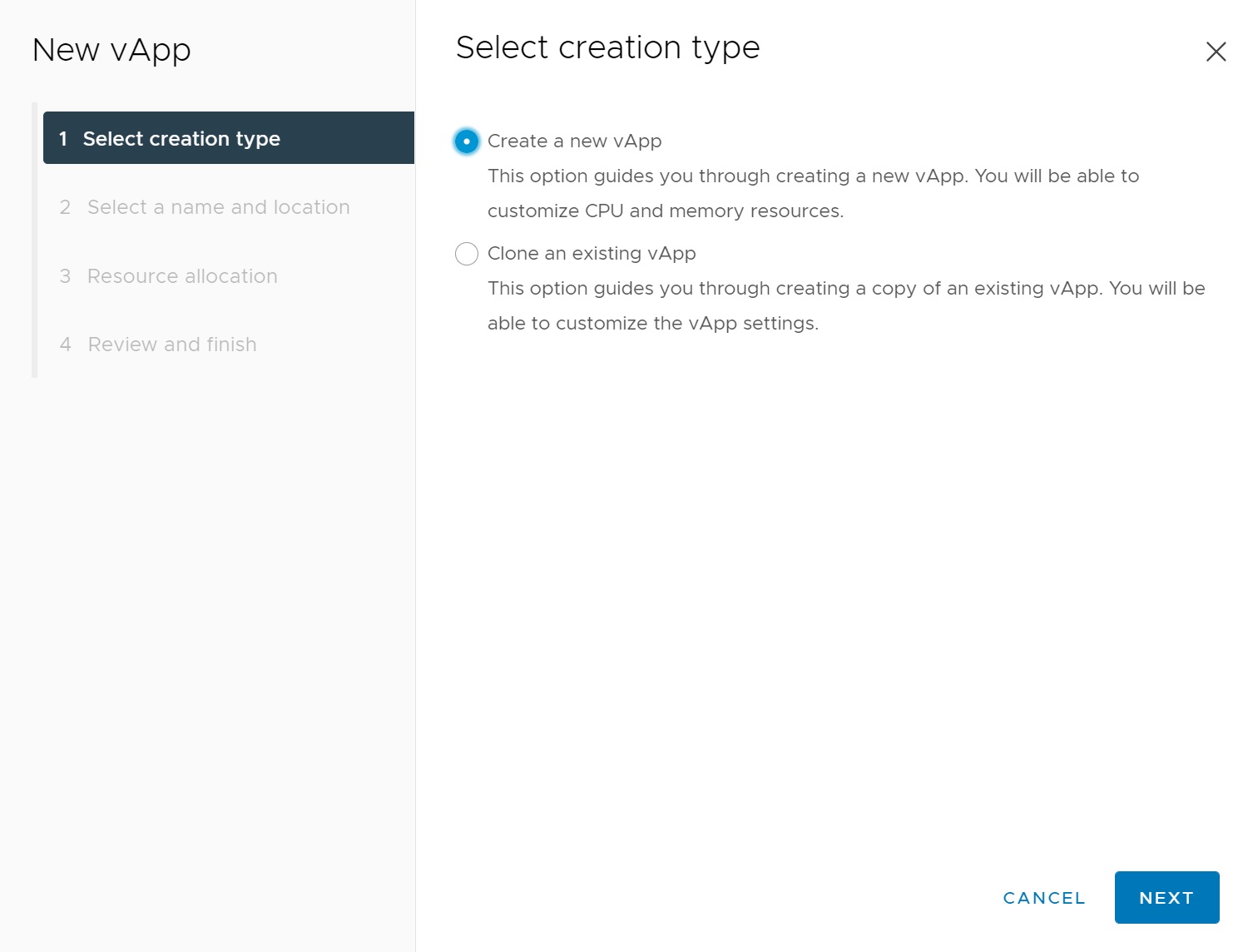 You create a vApp at the ESXi host inside a Datacenter, you will be taken to a series of setup screens