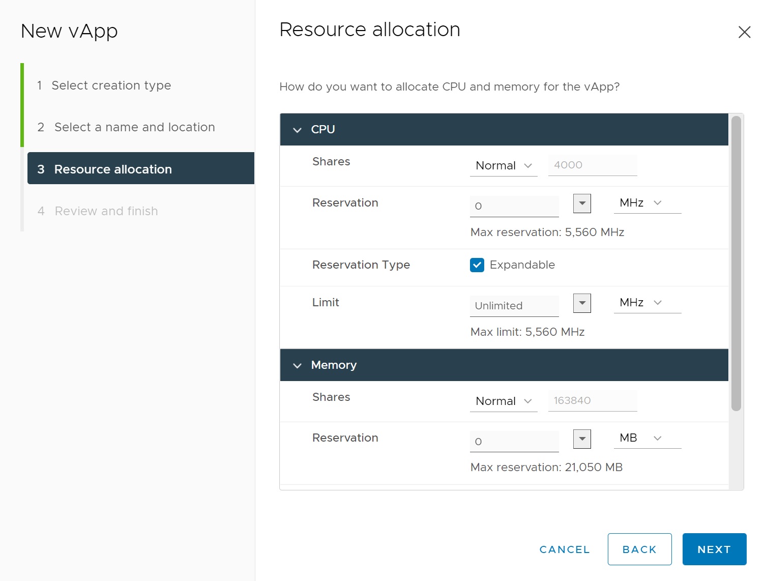 | Reservation | Defines the guaranteed CPU or memory allocation for this vApp. |