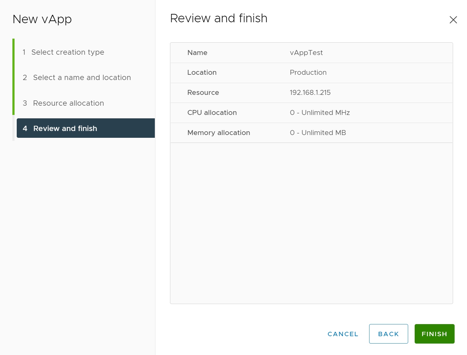 Finally we get to a summary screen, click FINISH to create the the vApp