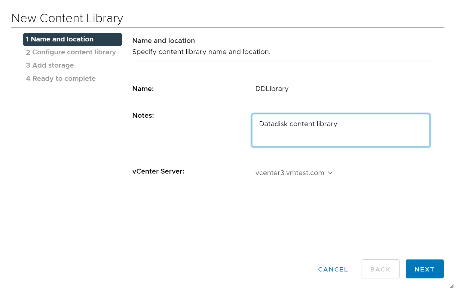When you select to create a new library a series of setup screens appear, the first requests the name of the library, notes and the vCenter server, later we will see how you can subscribe to another vCenter and thus you may have options to create the library on a remote vCenter server.