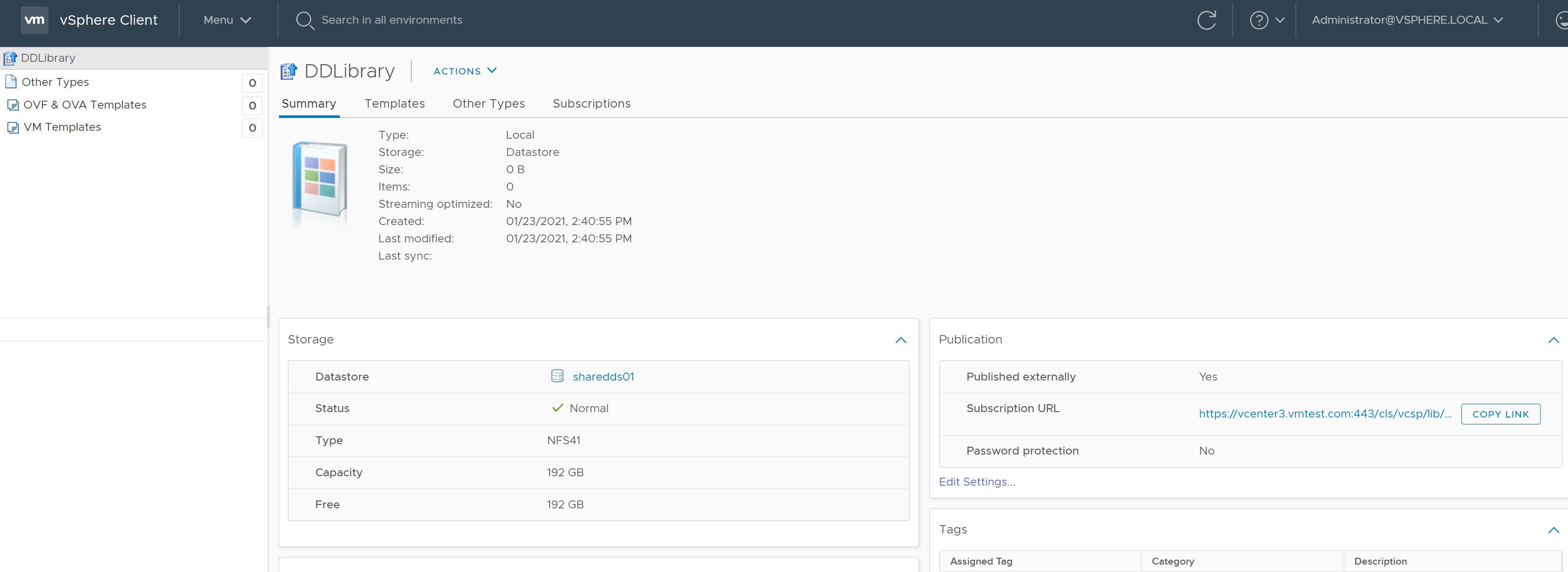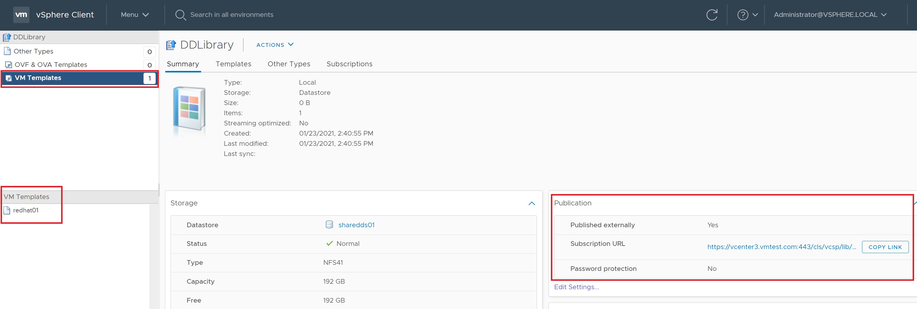 Once the template has been created, we return to the specific library menu and you will see that it now has a template stored, now that we have a template we could get other vCenter to subscribe to this library using the Publication details (the URL) on the right-hand side.