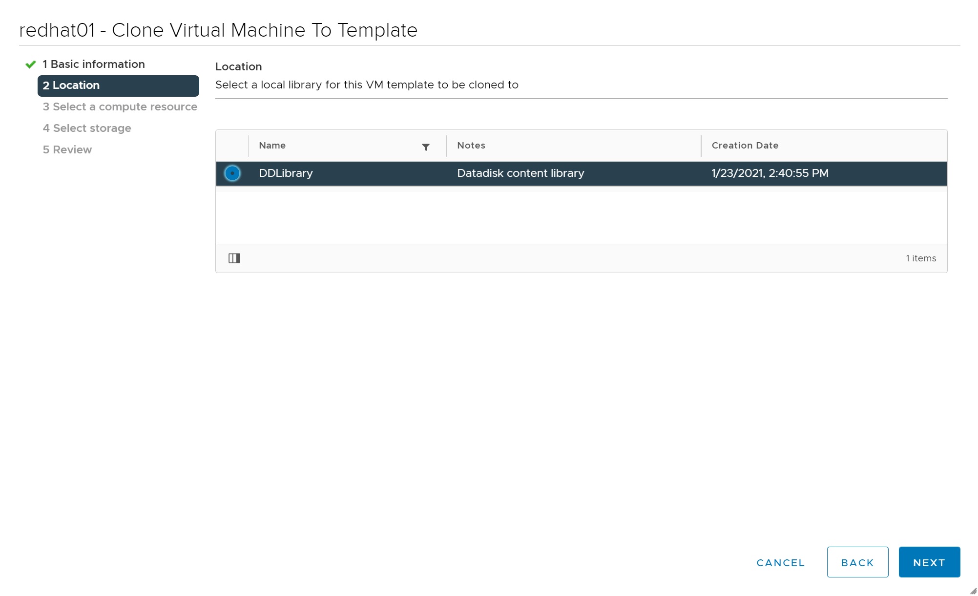 Next we select the datastore where the library wil be located, remember if you are storing large VM's, Templates, ISO images make sure you have enough space.