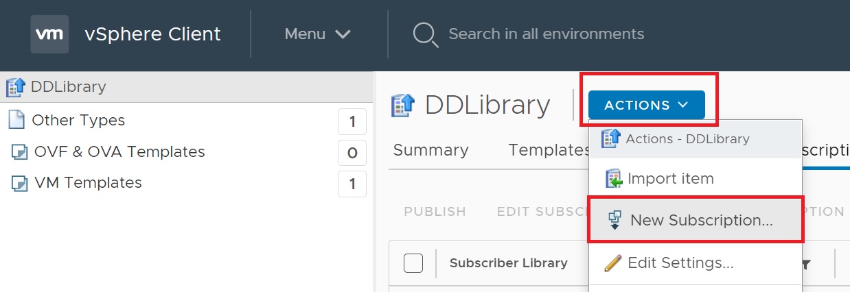 I will subscribe to the same vCenter server but it's no different when subscribing to another vCenter server, select the subscriptions tab -> ACTIONS -> New Subscription
