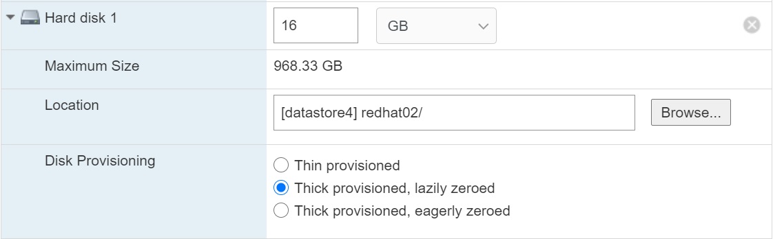 | thick/lazily zeroed | then this type of virtual disk is created it takes up all the space you allocate, ESX virtual disks do not grow as more data is created inside them, this format offers the best performance. As a flat file, the virtual disk will be created in contiguous blocks within the VMFS volume. When the disk is created the file is created very quickly and any existing data on the physical disk is overwritten as data is written to the virtual disk as needed. |