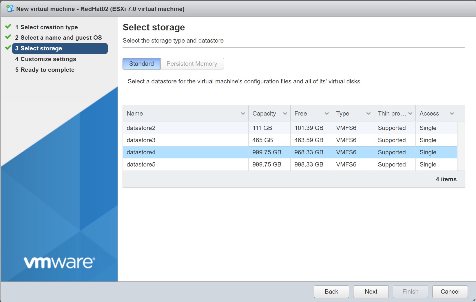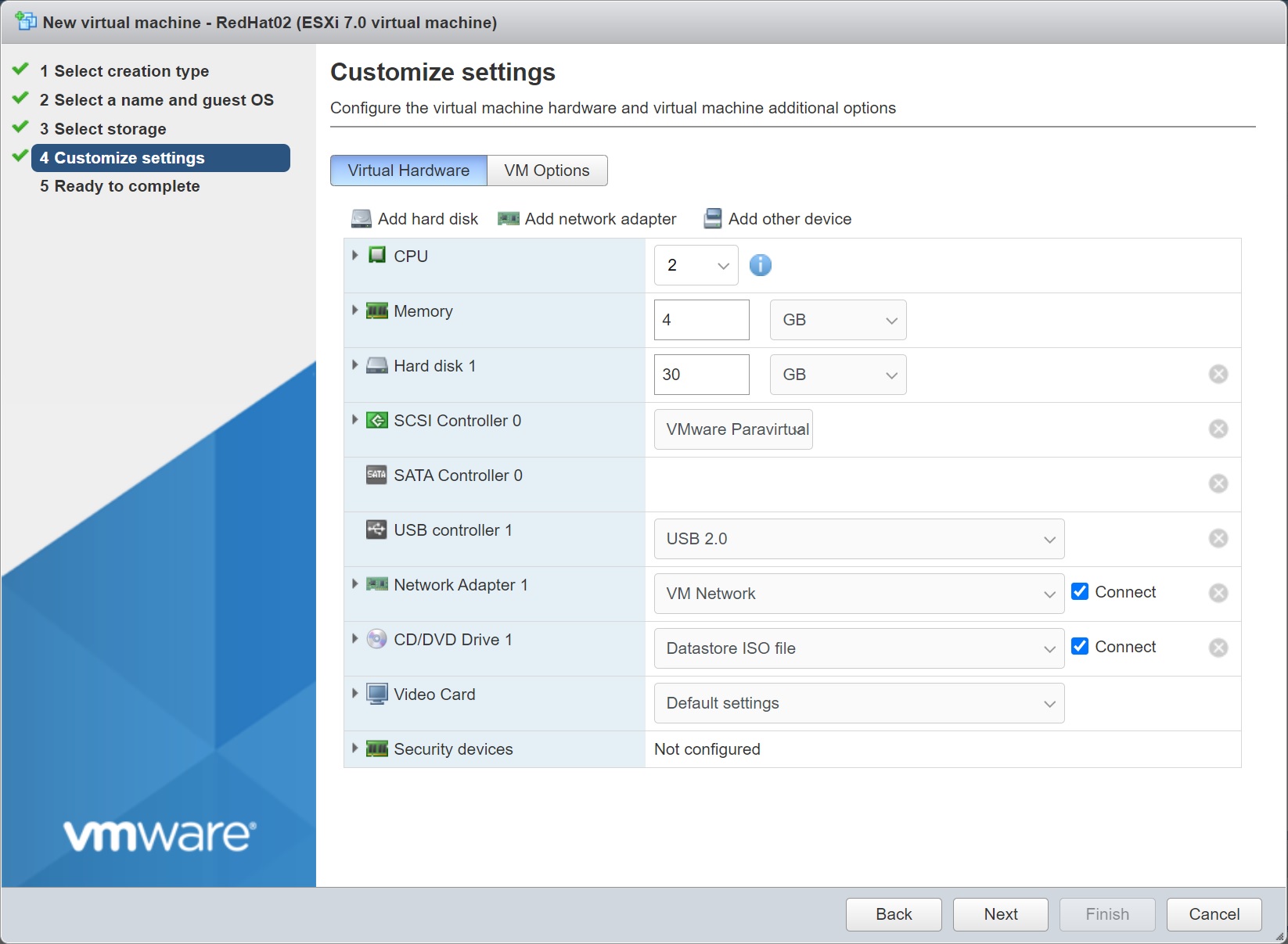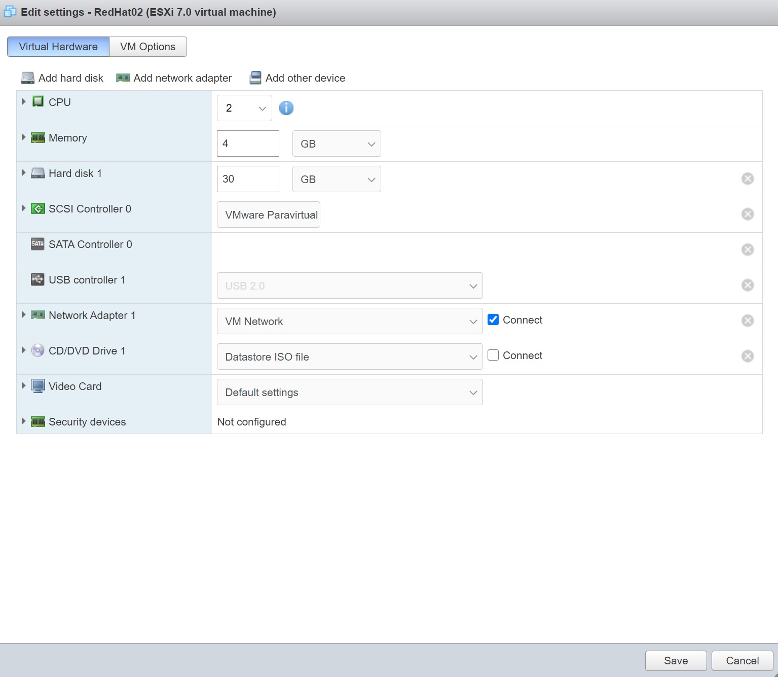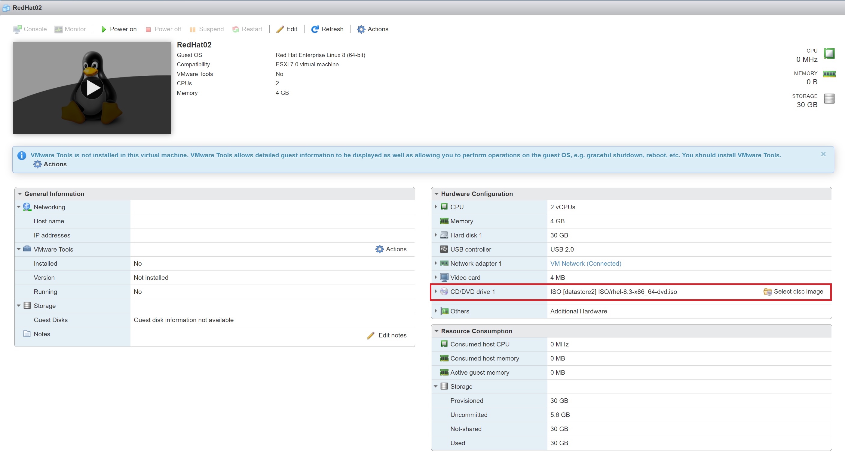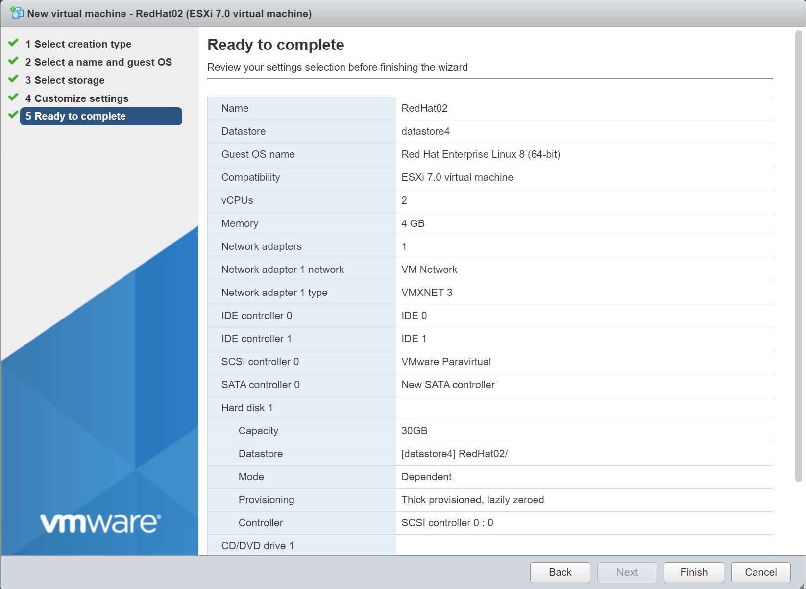 Lets create our first VM, I will be installing the RedHat 8.3 O/S, I will also be using a ISO file which will be stored on one of the virtual storage area's to boot from and perform the installation. I generally create a ISO folder on a datastore that is not used for VM's to store all my ISO images.