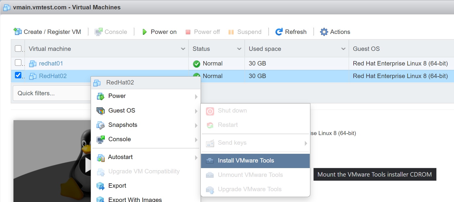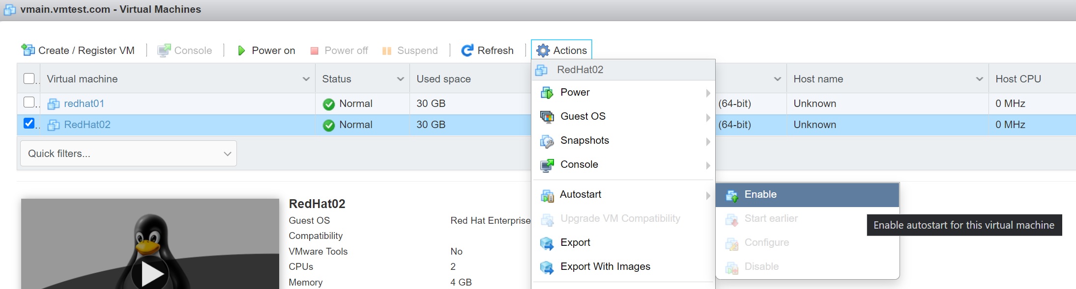 | Automatically start and stop a VM | ESX has the ability to gracefully power off/on your VMs if you chose to shut down or reboot a ESXi server, this guest shutdown feature requires you to install the VMware Tools on to each VM, most O/S now provide there own VM Tools but you can install the tools from the action drop down and selecting -> Guest OS -> Install VMware Tools