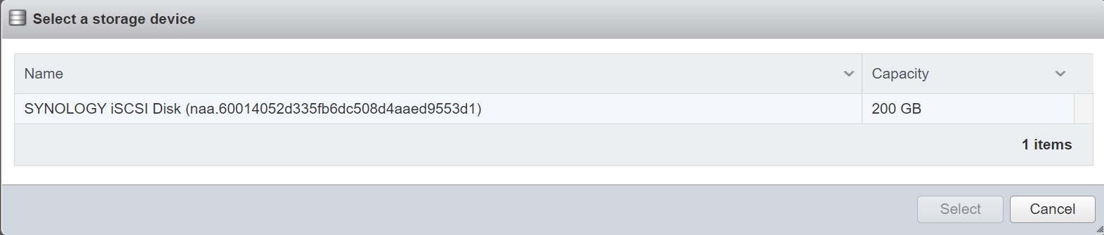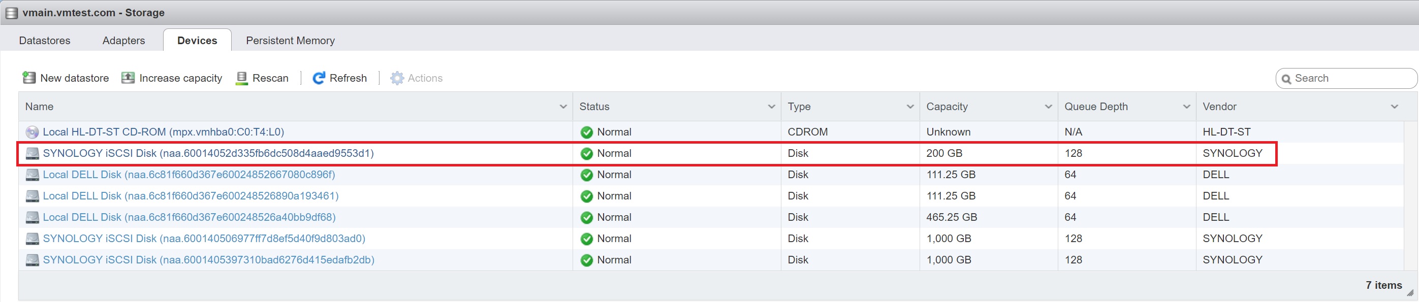 RDM will have a .vmdk extension just like virtual disks, they can be stored alongside the VM's other files or in a different datastore. First you need to setup a LUN to use, as you can see below i have created a 200GB LUN in my Synology SAN, make sure nothing else uses this LUN