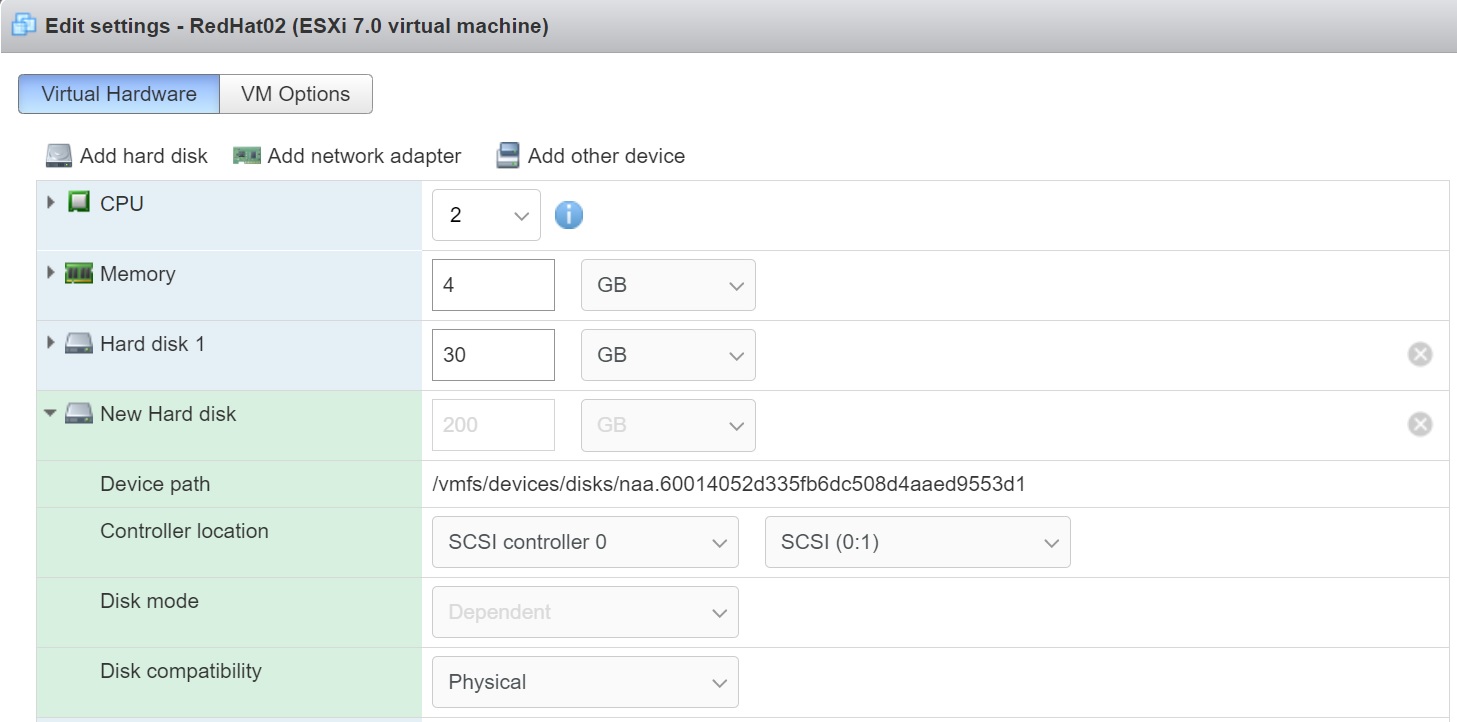 Once the LUN is selected it will be added to the VM, as you can see you have to use the whole LUN, it is attached to the SCSI controller and will take the next LUN ID