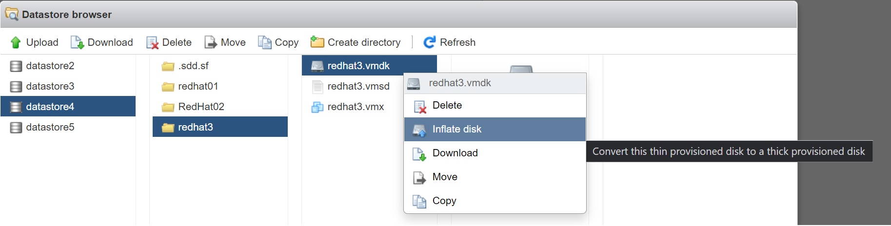 | Convert a thin disk to a thick disk | In older versions of ESX you had to use the vmkfstools command to change a disk type, the VM must be powered off and then locate the virtual disk that you wish to convert from the datastore that it resides in, then using the datastore browser and expand the VM's folder to display all the files, right-click the .vmdk file and select the inflate disk as per below, if this option is not available then the VM is already using thick provisioned disks.
