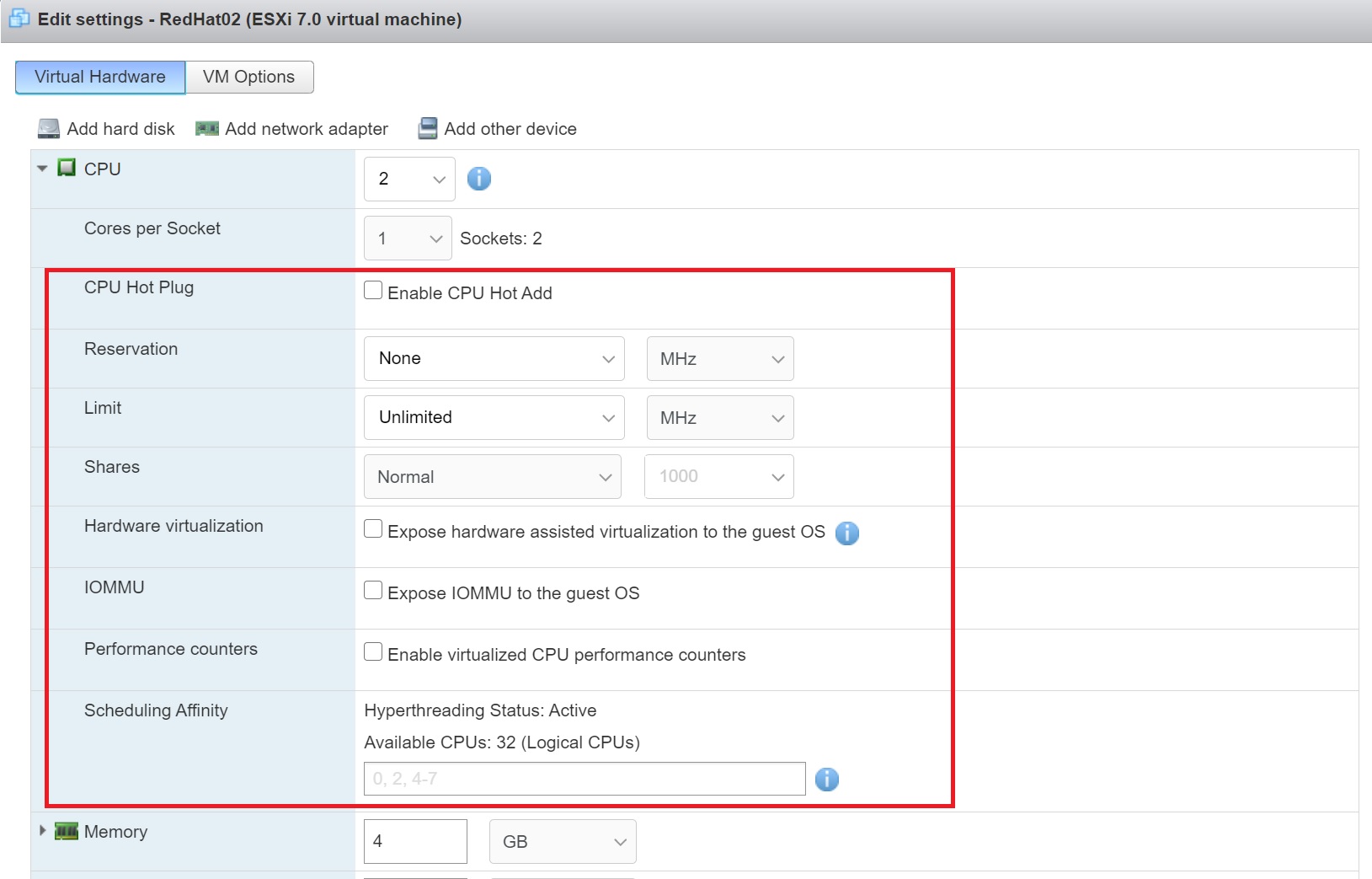 In previous versions there was one place to change options of the VM, in ESXi 7 you have drop downs in the CPU and Memory plus there is a VM Options button, I have a section regarding the virtual machine options