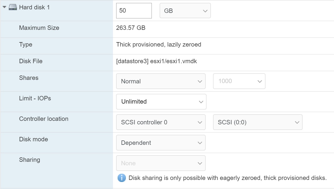 | Sharing | Specifies sharing information, disk sharing is only possible with eagerly zeroed, thick provisioned disks. |