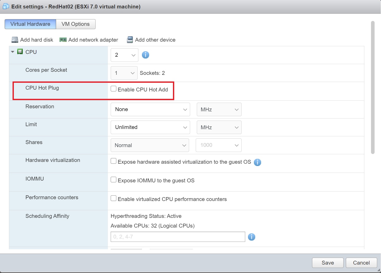 | CPU Hot Plug | By default, you cannot add CPU resources to a virtual machine when the virtual machine is turned on. The CPU hot add option lets you add CPU resources to a running virtual machine. There are a few requirements but you need at least these two latest version of VMware Tools installed and a guest operating system that supports CPU hot add. |
