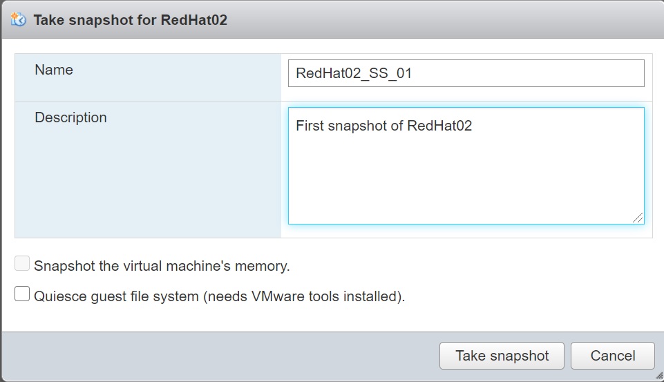 In the snapshot screen enter a name and a description of the snapshot, normally I reference a change control