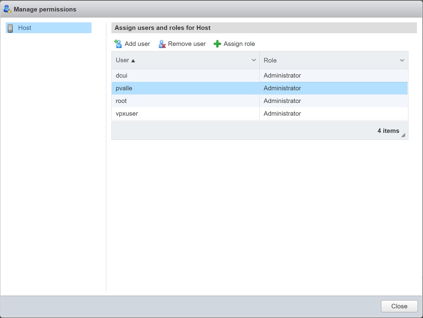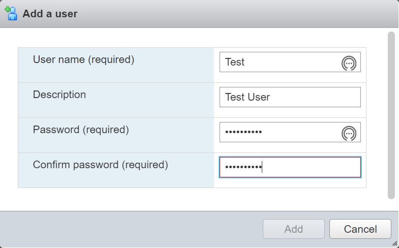 | Users | To create a new user select add user from the user screen, notice this screen does not detail the vpxuser and dcui users as they are really used by ESXi internally.