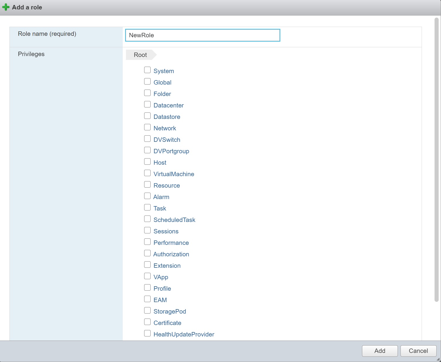 | VMware Consolidated Backup User | Allows just enough privileges for Consolidated backups to function | |