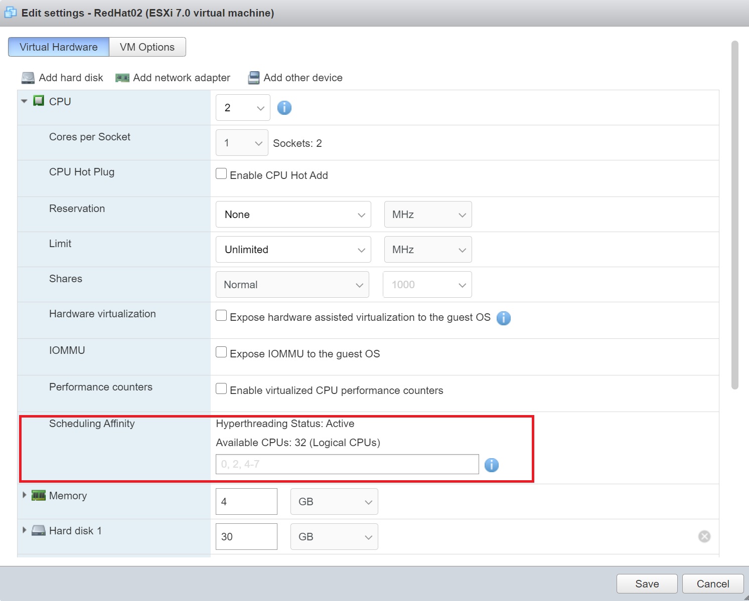 | Scheduling Affinity | The Scheduling Affinity option gives you detailed control over how virtual machine CPUs are distributed across the host's physical cores. The option supports hyperthreading if hyperthreading is enabled. ESXi generally manages processor scheduling well, even when hyperthreading is enabled. These settings are useful only for fine-tuning critical virtual machines. It is possible to get a performance boost when the VM is using a lot of context switching, controlling what CPU's can be used can reduce the context switch to a minimum number of CPU cores. You can also select the processors to use, using scheduling affinity (see below image)