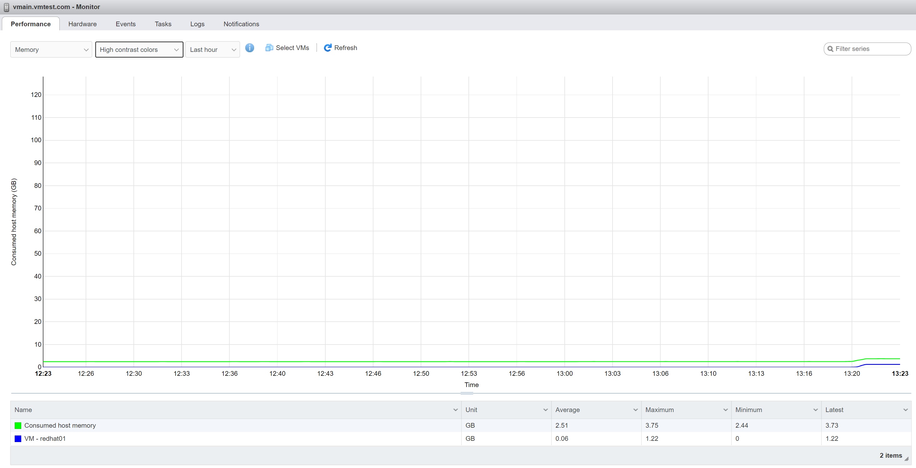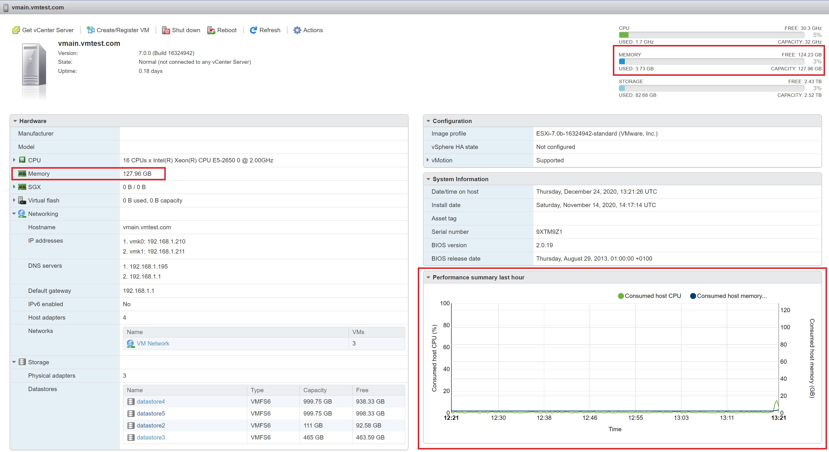 The main screen of the physical ESXi server details the available physical memory of the server, in text and graphical. There is also a chart of the consumed memory (and CPU resources) of the physical server.