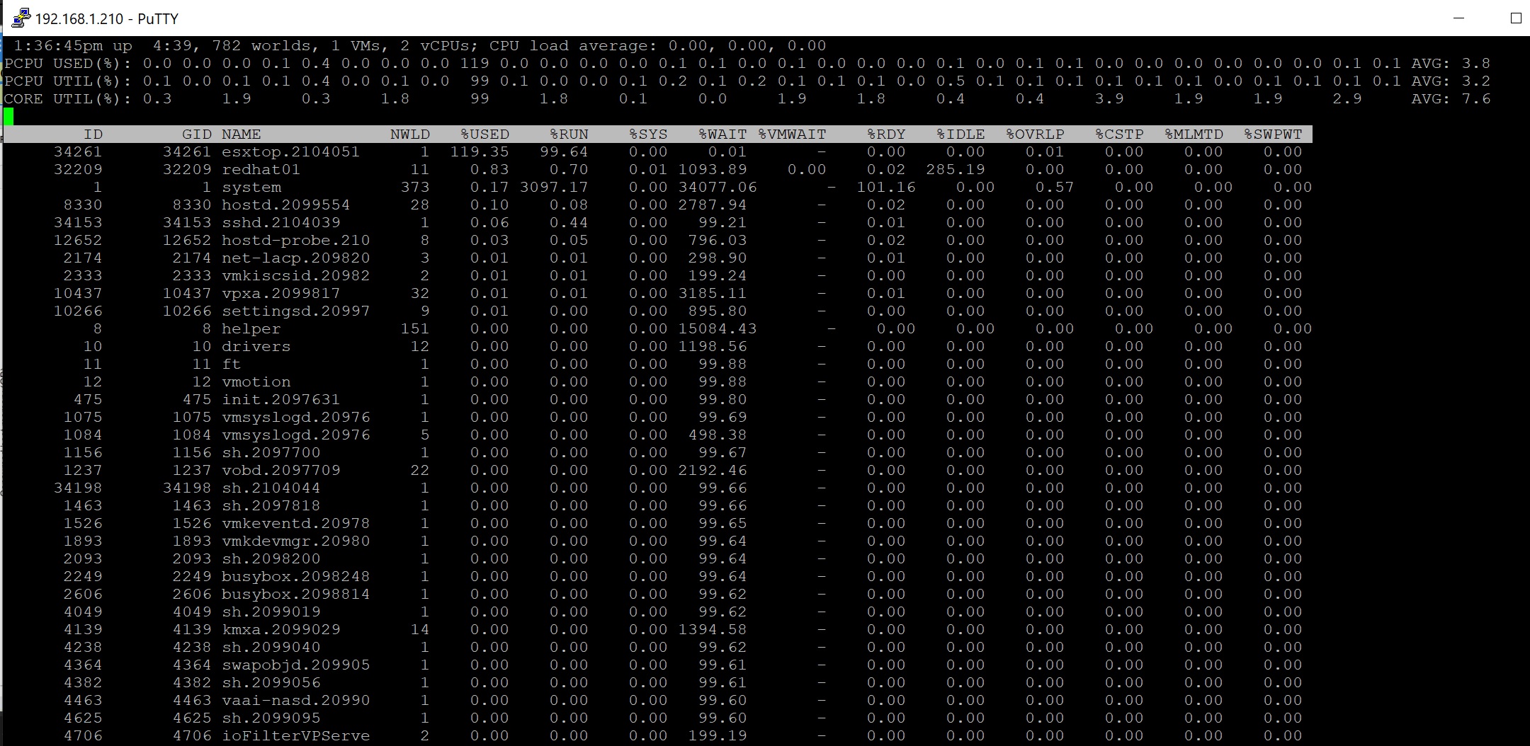| Network | There is a close relationship between network activity and physical CPU usage, this is because the load-balancing mechanism of the IP hash in itself causes the VMKernel to use the physical CPU. Lots of small TCP transactions inside a VM can cause the physical CPU to be busy, as the VMKernel needs to move packets from the physical NIC to the virtual NIC via the vSwitch. Make sure that VMware tools has been installed (installs a virtual networking driver) and make sure that if traffic shaping has been setup that it is correct (it could be throttling bandwidth). |