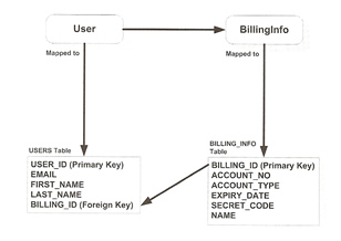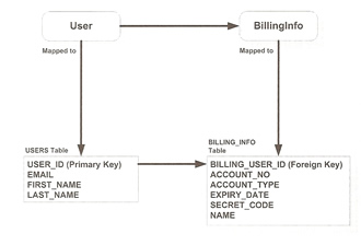 The code | public class User { protected String userId; protected String email; // Object reference for one-to-one relationship protected BillingInfo billings; } public class BillingInfo { protected String creditCardType; protected String creditCardNumber; ... } |