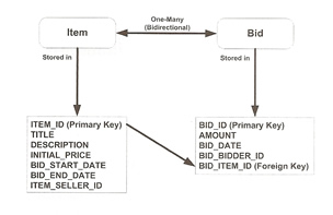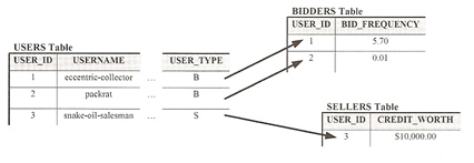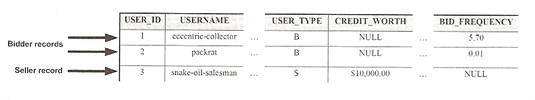 The USERS table contains data common to all users such as USER_ID and USERNAME, Bidder specific data such as BID_FREQUENCY and seller specific data such as CREDIT_WORTH, its all contained in a single table, records 1 and 2 contain bidder records and record 3 contains a sellers record. The persistence provider maps each user type to the table by storing persistent data into the relevant mapped columns, setting the USER_TYPE correctly and leaving the rest of the values NULL.